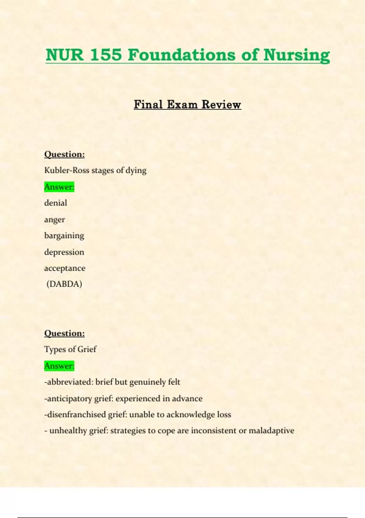 NUR155 / NUR 155 Final Exam Review (Latest 2024 / 2025): Foundations of Nursing - Galen
