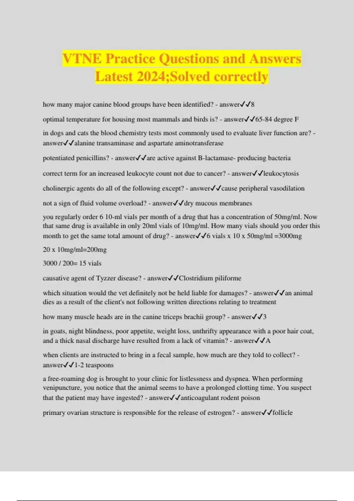 VTNE Practice Questions and Answers Latest 2024;Solved correctly how many major canine blood groups have been identified? - answer8 optimal temperature for housing most mammals and birds is? - answer65-84 degree F in dogs and cats the blood chemistry tests most commonly used to evaluate liver function are? - answeralanine transaminase and aspartate aminotransferase potentiated penicillins? - answerare active against B-lactamase- producing bacteria correct term for an increased leukocyte count not due to cancer? - answerleukocytosis cholinergic agents do all of the following except? - answercause peripheral vasodilation not a sign of fluid volume overload? - answerdry mucous membranes you regularly order 6 10-ml vials per month of a drug that has a concentration of 50mg/ml. Now that same drug is available in only 20ml vials of 10mg/ml. How many vials should you order this month to get the same total amount of drug? - answer6 vials x 10 x 50mg/ml =3000mg 20 x 10mg/ml=200mg 3000 / 200= 15 vials causative agent of Tyzzer disease? - answerClostridium piliforme which situation would the vet definitely not be held liable for damages? - answeran animal dies as a result of the client's not following written directions relating to treatment how many muscle heads are in the canine triceps brachii group? - answer3 in goats, night blindness, poor appetite, weight loss, unthrifty appearance with a poor hair coat, and a thick nasal discharge have resulted from a lack of vitamin? - answerA when clients are instructed to bring in a fecal sample, how much are they told to collect? - answer1-2 teaspoons a free-roaming dog is brought to your clinic for listlessness and dyspnea. When performing venipuncture, you notice that the animal seems to have a prolonged clotting time. You suspect that the patient may have ingested? - answeranticoagulant rodent poison primary ovarian structure is responsible for the release of estrogen? - answerfollicle higher the hematocrit and total protein values, the greater the degree of? - answerdehydration minimum relative humidity in a neonatal puppy housing unit should be? - answer50% cardiac arrhythmias that occur during anesthesia are commonly associated with all of the following except? - answernormocapnia 2 tooth buds that grow together to form one larger tooth is referred to as? - answerfusion anterior drawer movement detects a problem with the? - answerstifle underlying disease for most cases of feline aortic thromboembolism is? - answermyocardial disease local anesthetics? - answerprevent nerve cell depolarization male guinea pig is called a? - answerboar false about eruption of permanent teeth? - answerpermanent lower canines erupt buccal to the deciduous canines failure of an organ or a part of an organ to grow to its full size is an example of? - answerhypoplasia steatorrhea refers to? - answerfat in the stool to supply nearly adequate nutrition via the IV route, solutions used must be? - answerhypertonic drug is the most potent sedative? - answerdetomidine to flash sterilize an instrument, the autoclave settings should be? - answer270 degree F, 30 lb pressure, 4 min, fast exhaust agent, method, or device is most appropriate for sterilizing a pair of dissecting scissors to be used in a surgical procedure? - answerliquid chemical disinfectant on a CBC, all of the following findings could be expected in a patient with an infection, except? - answernarrow buffy coat what species has multiple forms of reticulocytes? - answercat an expectorant is a drug that acts to? - answerliquefy and dilute viscous secretions in the respiratory tract extent to which measurements agree with the true value of the quantity measured is? - answeraccurac