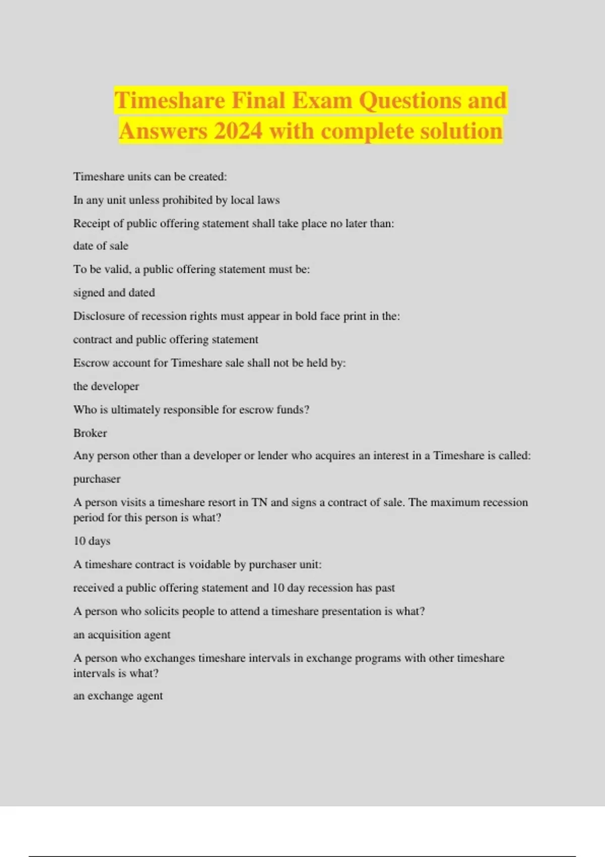 Timeshare Final Exam Questions and Answers 2024 with complete solution Timeshare units can be created: In any unit unless prohibited by local laws Receipt of public offering statement shall take place no later than: date of sale To be valid, a public offering statement must be: signed and dated Disclosure of recession rights must appear in bold face print in the: contract and public offering statement Escrow account for Timeshare sale shall not be held by: the developer Who is ultimately responsible for escrow funds? Broker Any person other than a developer or lender who acquires an interest in a Timeshare is called: purchaser A person visits a timeshare resort in TN and signs a contract of sale. The maximum recession period for this person is what? 10 days A timeshare contract is voidable by purchaser unit: received a public offering statement and 10 day recession has past A person who solicits people to attend a timeshare presentation is what? an acquisition agent A person who exchanges timeshare intervals in exchange programs with other timeshare intervals is what? an exchange agent Price increase in timeshare can not be announced more than how many days prior to the effective date? 60 days If an unlicensed person is fined by TRE