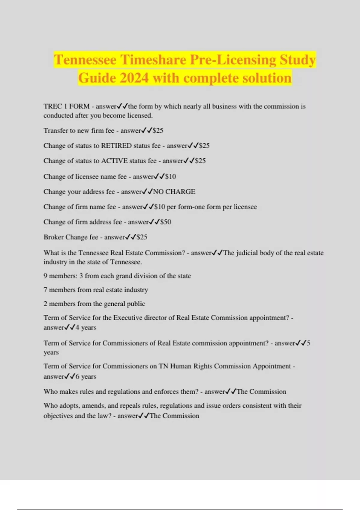 Tennessee Timeshare Pre-Licensing Study Guide 2024 with complete solution