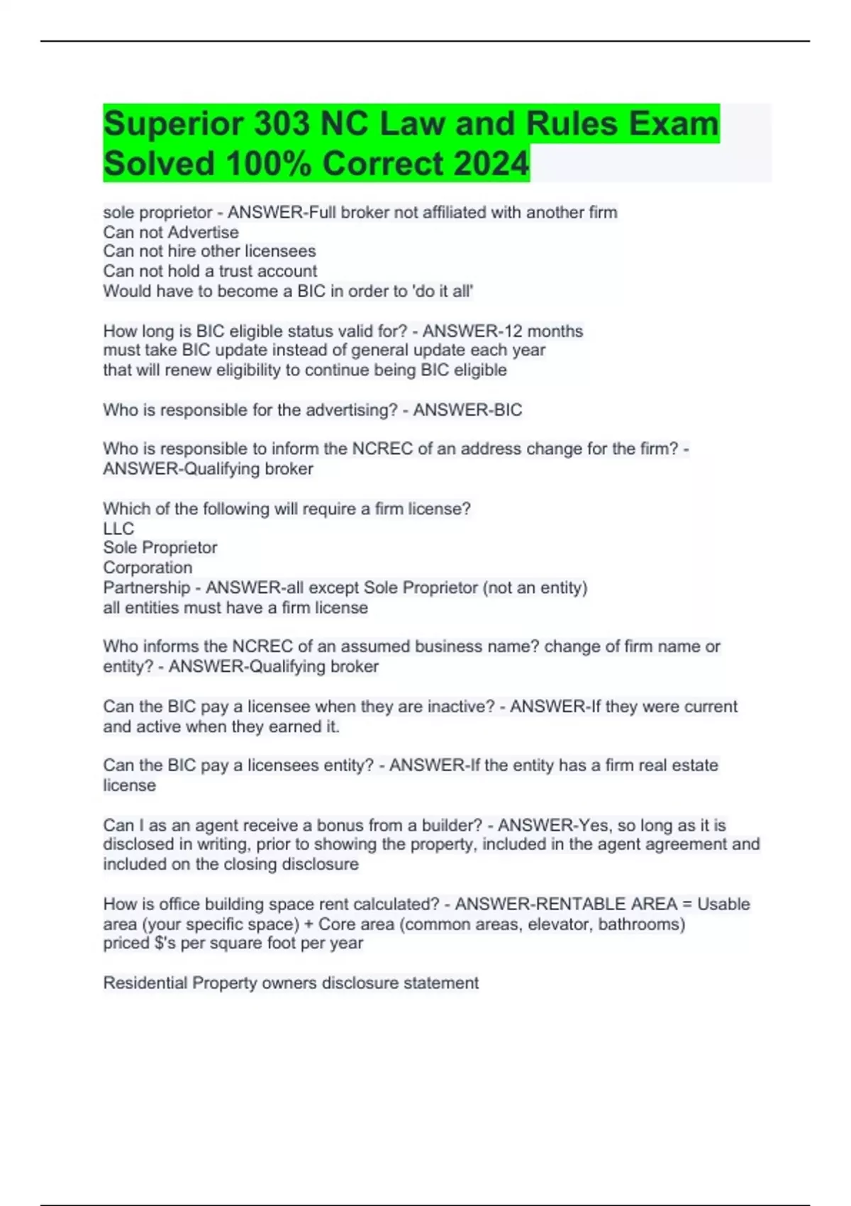 Superior 303 NC Law and Rules Exam Solved 100% Correct 2024
