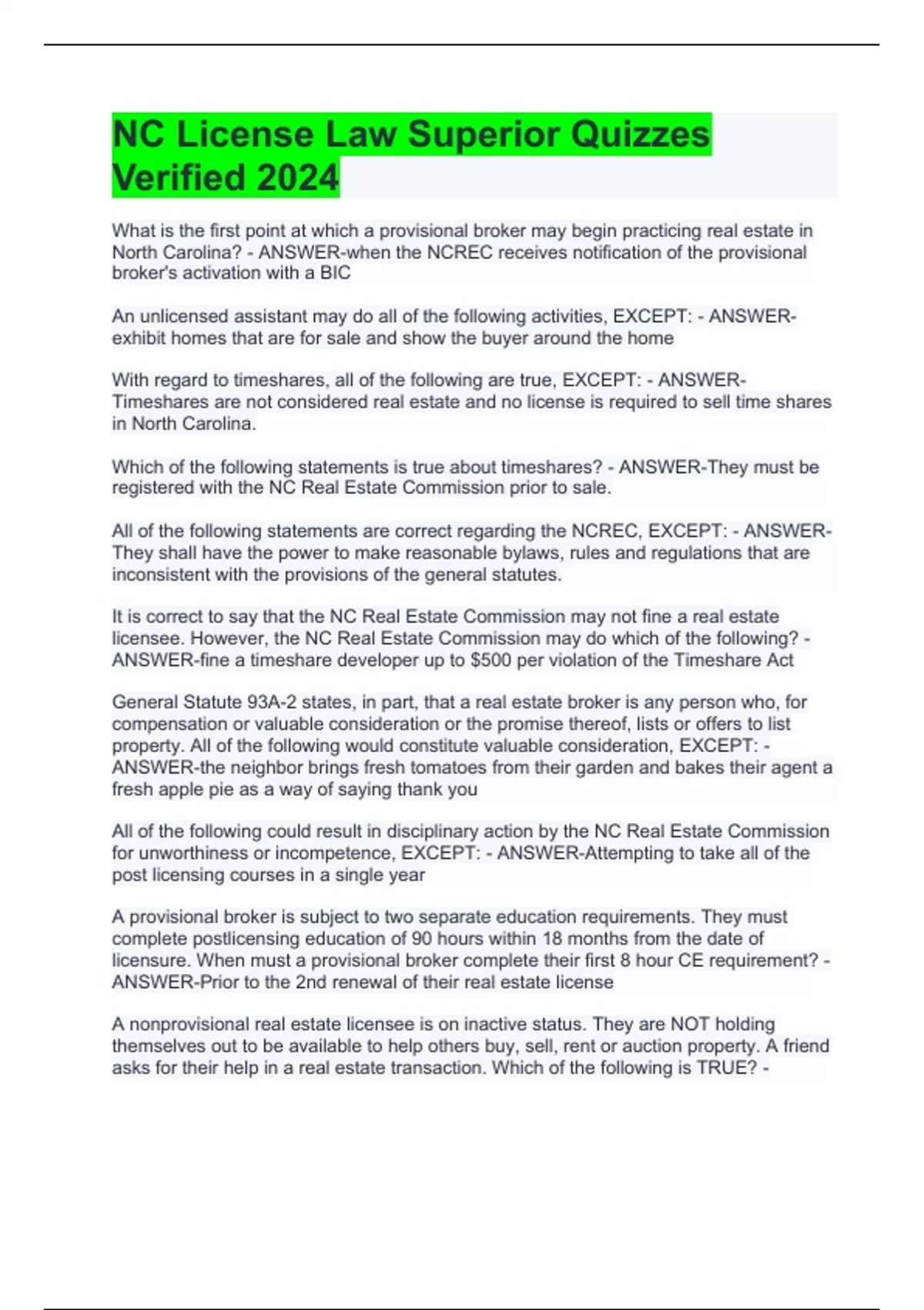 nc license law superior quizzes verified 2024
