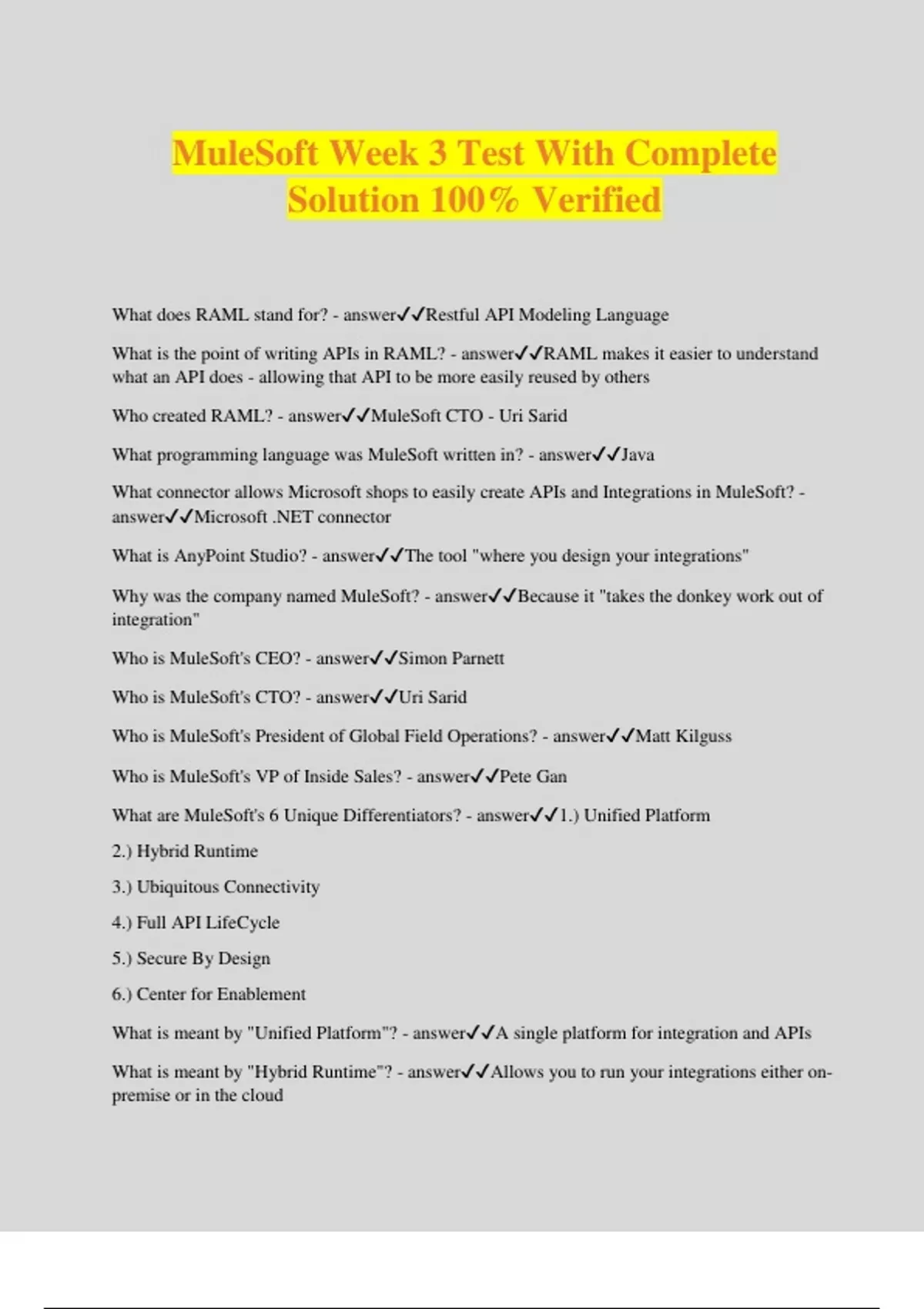 MuleSoft Week 3 Test With Complete Solution 100% Verified What does RAML stand for? - answerRestful API Modeling Language What is the point of writing APIs in RAML? - answerRAML makes it easier to understand what an API does - allowing that API to be more easily reused by others Who created RAML? - answerMuleSoft CTO - Uri Sarid What programming language was MuleSoft written in? - answerJava What connector allows Microsoft shops to easily create APIs and Integrations in MuleSoft? - answerMicrosoft .NET connector What is AnyPoint Studio? - answerThe tool "where you design your integrations" Why was the company named MuleSoft? - answerBecause it "takes the donkey work out of integration" Who is MuleSoft's CEO? - answerSimon Parnett Who is MuleSoft's CTO? - answerUri Sarid Who is MuleSoft's President of Global Field Operations? - answerMatt Kilguss Who is MuleSoft's VP of Inside Sales? - answerPete Gan What are MuleSoft's 6 Unique Differentiators? - answer1.) Unified Platform 2.) Hybrid Runtime 3.) Ubiquitous Connectivity 4.) Full API LifeCycle 5.) Secure By Design 6.) Center for Enablement What is meant by "Unified Platform"? - answerA single platform for integration and APIs What is meant by "Hybrid Runtime"? - answerAllows you to run your integrations either on- premise or in the cloud What is meant by "Ubiquitous Connectivity"? - answerThe ability to connect anything to everything What is meant by "Full API Lifecycle"? - answerEvery API created with MuleSoft will be designed for reuse, managed for security, shared to Anypoint Exchange, and able to have analytics performed What is meant by "Secure by Design"? - answerSince MuleSoft uses API-led connectivity and APIs are around every part of your system, and since every API is managed for security, your entire platform is secure What is meant by "Center for Enablement"? - answerA change management process for promoting reuse of APIs and the Anypoint Exchange How are companies currently using APIs? - answerTo expose data to their customers, partners, and other internal employees Explain the Uber and Google Maps use case for APIs - answerUber utilizes the Google Maps platform by connecting to their public API in order to use the Google Maps functionality on their app. Benefits to Uber: didn't have to "reinvent the wheel" and build their own (likely inferior) maps Benefits to Google: Additional revenue stream through valuable customer insights and/or by charging Uber to use their API Explain the Tinder and Facebook use case for APIs - answerTinder utilizes the Facebook customer info and signup platform by connecting to their public API in order to quickly get that info for their app. Benefits to Tinder: didn't have to "reinvent the wheel" and build their own customer information and signup platform Benefits to Facebook: Additional revenue stream through valuable customer insights and better ad targeting by knowing which of their users also use Tinder/or by charging Tinder to use their API What is API-led connectivity? - answerMuleSoft's approach to IT. Centers around viewing APIs as reusable assets to increase delivery speed and close the IT delivery gap. Main benefit is innovating faster because you're not reinventing the wheel each time a new team needs access to a system, process, or experience. Utilizes three layers of APIs in order to make this ha
