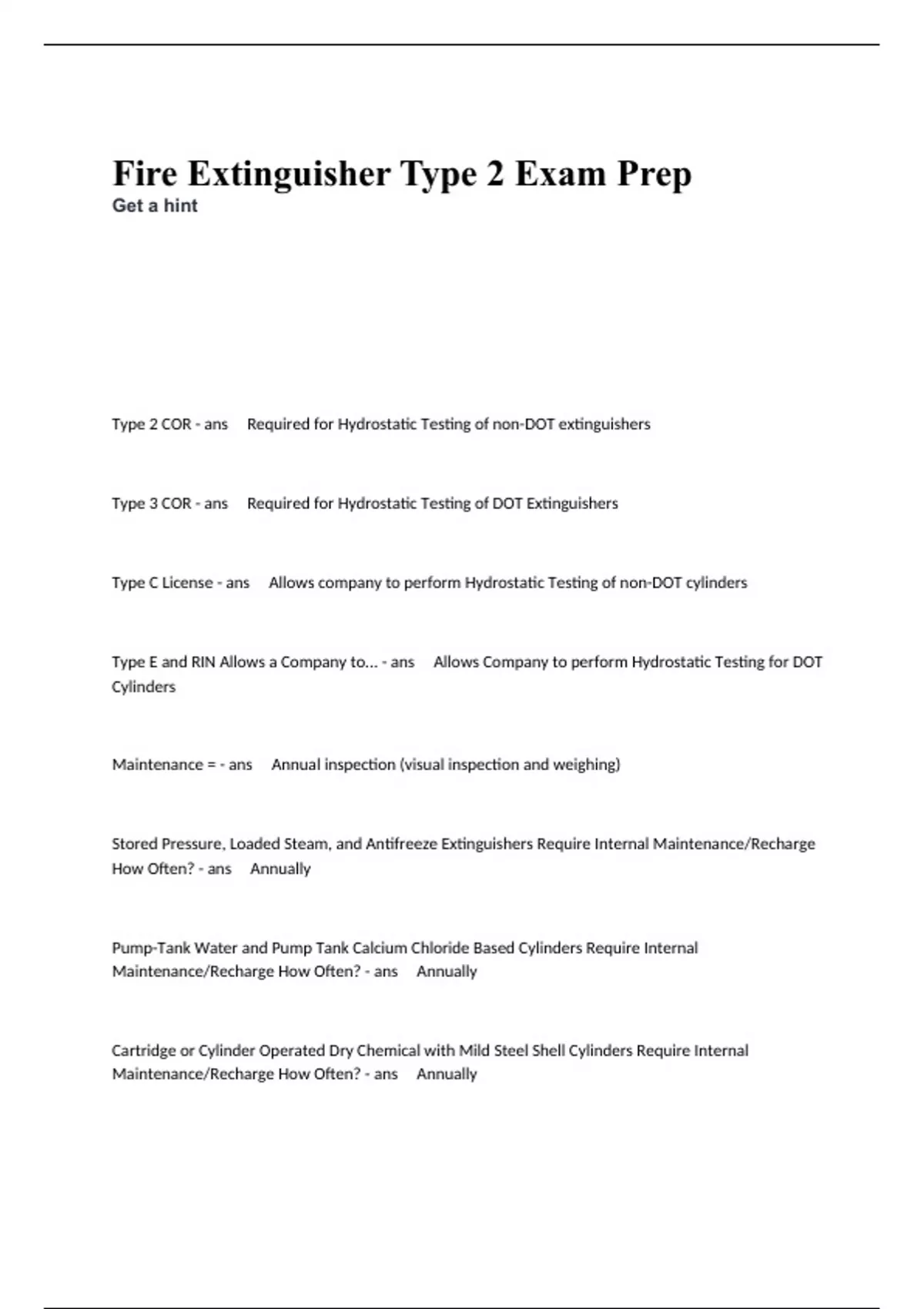 Type 2 COR - ans Required for Hydrostatic Testing of non-DOT extinguishers Type 3 COR - ans Required for Hydrostatic Testing of DOT Extinguishers Type C License - ans Allows company to perform Hydrostatic Testing of non-DOT cylinders Type E and RIN Allows a Company to... - ans Allows Company to perform Hydrostatic Testing for DOT Cylinders Maintenance = - ans Annual inspection (visual inspection and weighing) Stored Pressure, Loaded Steam, and Antifreeze Extinguishers Require Internal Maintenance/Recharge How Often? - ans Annually Pump-Tank Water and Pump Tank Calcium Chloride Based Cylinders Require Internal Maintenance/Recharge How Often? - ans Annually Cartridge or Cylinder Operated Dry Chemical with Mild Steel Shell Cylinders Require Internal Maintenance/Recharge How Often? - ans Annually