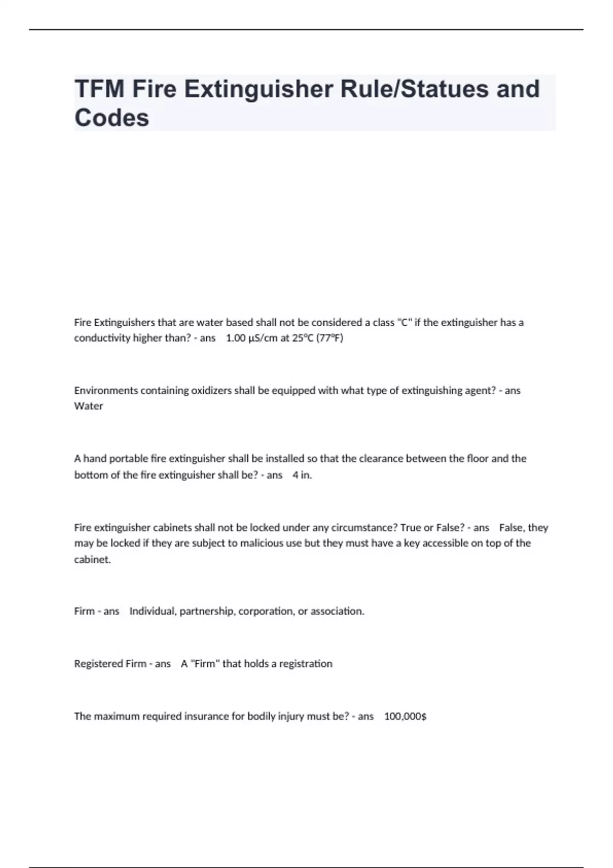 Fire Extinguishers that are water based shall not be considered a class "C" if the extinguisher has a conductivity higher than? - ans 1.00 µS/cm at 25°C (77°F) Environments containing oxidizers shall be equipped with what type of extinguishing agent? - ans Water A hand portable fire extinguisher shall be installed so that the clearance between the floor and the bottom of the fire extinguisher shall be? - ans 4 in. Fire extinguisher cabinets shall not be locked under any circumstance? True or False? - ans False, they may be locked if they are subject to malicious use but they must have a key accessible on top of the cabinet. Firm - ans Individual, partnership, corporation, or association. Registered Firm - ans A "Firm" that holds a registration The maximum required insurance for bodily injury must be? - ans 100,000$
