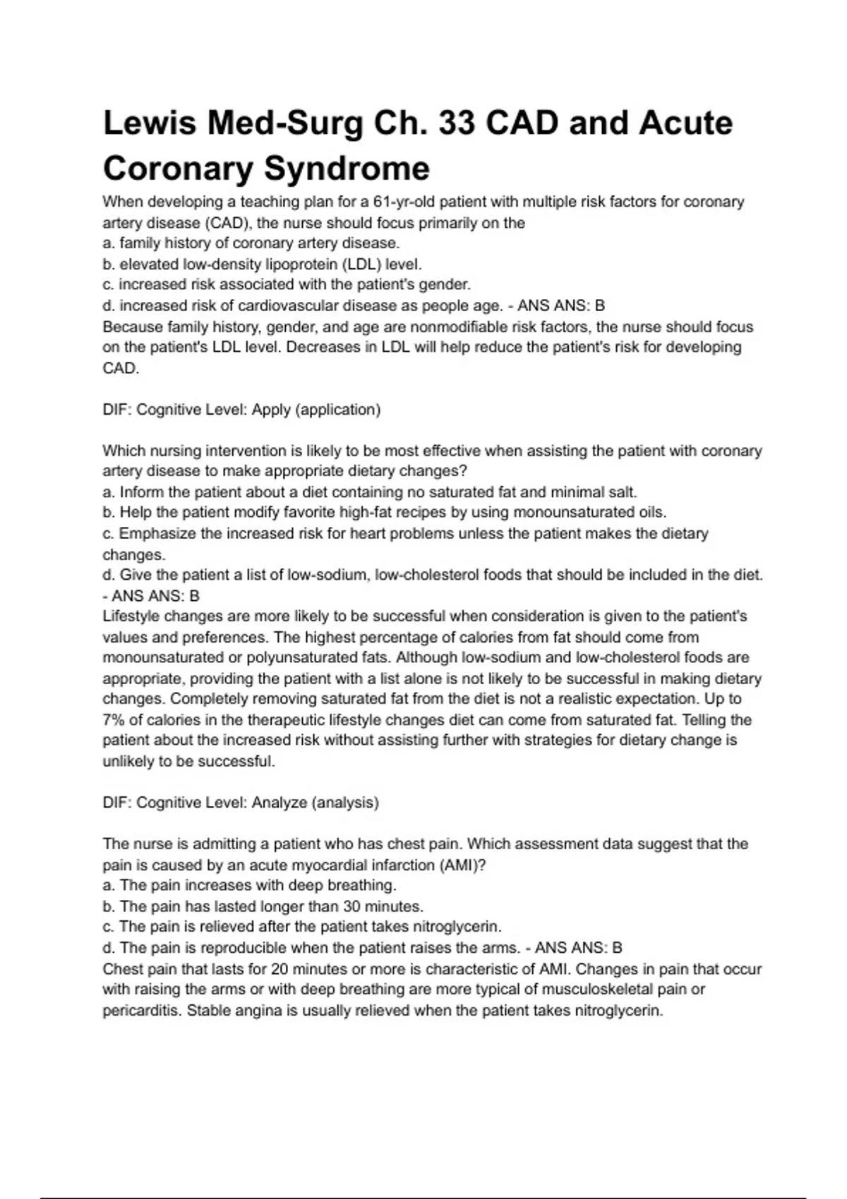 Lewis Med-Surg Ch. 33 CAD and Acute Coronary Syndrome ( Q&A ) A+ RATED When developing a teaching plan for a 61-yr-old patient with multiple risk factors for coronary artery disease (CAD), the nurse should focus primarily on the a. family history of coronary artery disease. b. elevated low-density lipoprotein (LDL) level. c. increased risk associated with the patient's gender. d. increased risk of cardiovascular disease as people age. - ANS ANS: B Because family history, gender, and age are nonmodifiable risk factors, the nurse should focus on the patient's LDL level. Decreases in LDL will help reduce the patient's risk for developing CAD. DIF: Cognitive Level: Apply (application) Which nursing intervention is likely to be most effective when assisting the patient with coronary artery disease to make appropriate dietary changes? a. Inform the patient about a diet containing no saturated fat and minimal salt. b. Help the patient modify favorite high-fat recipes by using monounsaturated oils. c. Emphasize the increased risk for heart problems unless the patient makes the dietary changes. d. Give the patient a list of low-sodium, low-cholesterol foods that should be included in the diet. - ANS ANS: B Lifestyle changes are more likely to be successful when consideration is given to the patient's values and preferences. The highest percentage of calories from fat should come from monounsaturated or polyunsaturated fats. Although low-sodium and low-cholesterol foods are appropriate, providing the patient with a list alone is not likely to be successful in making dietary changes. Completely removing saturated fat from the diet is not a realistic expectation. Up to 7% of calories in the therapeutic lifestyle changes diet can come from saturated fat. Telling the patient about the increased risk without assisting further with strategies for dietary change is unlikely to be successful.