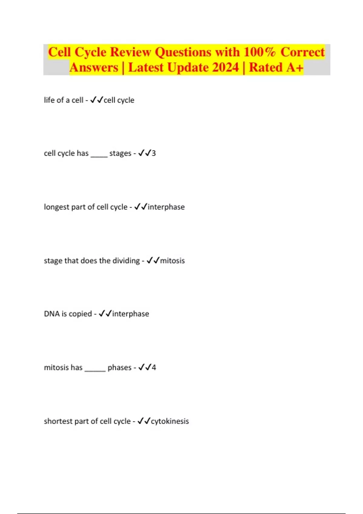 Cell Cycle Review Questions with 100% Correct Answers | Latest Update 2024 | Rated A+