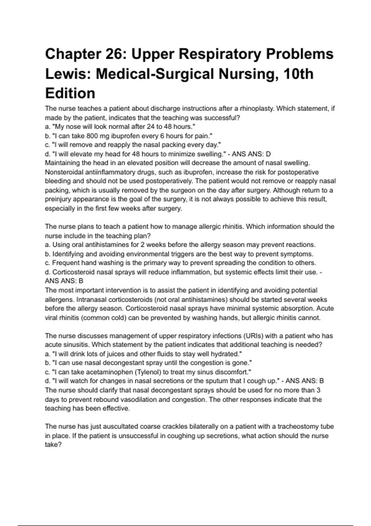 Chapter 26: Upper Respiratory Problems Lewis: Medical-Surgical Nursing, 10th Edition The nurse teaches a patient about discharge instructions after a rhinoplasty. Which statement, if made by the patient, indicates that the teaching was successful? a. "My nose will look normal after 24 to 48 hours." b. "I can take 800 mg ibuprofen every 6 hours for pain." c. "I will remove and reapply the nasal packing every day." d. "I will elevate my head for 48 hours to minimize swelling." - ANS ANS: D Maintaining the head in an elevated position will decrease the amount of nasal swelling. Nonsteroidal antiinflammatory drugs, such as ibuprofen, increase the risk for postoperative bleeding and should not be used postoperatively. The patient would not remove or reapply nasal packing, which is usually removed by the surgeon on the day after surgery. Although return to a preinjury appearance is the goal of the surgery, it is not always possible to achieve this result, especially in the first few weeks after surgery. The nurse plans to teach a patient how to manage allergic rhinitis. Which information should the nurse include in the teaching plan? a. Using oral antihistamines for 2 weeks before the allergy season may prevent reactions. b. Identifying and avoiding environmental triggers are the best way to prevent symptoms. c. Frequent hand washing is the primary way to prevent spreading the condition to others. d. Corticosteroid nasal sprays will reduce inflammation, but systemic effects limit their use. - ANS ANS: B The most important intervention is to assist the patient in identifying and avoiding potential allergens. Intranasal corticosteroids (not oral antihistamines) should be started several weeks before the allergy season. Corticosteroid nasal sprays have minimal systemic absorption. Acute viral rhinitis (common cold) can be prevented by washing hands, but allergic rhinitis cannot. The nurse discusses management of upper respiratory infections (URIs) with a patient who has acute sinusitis. Which statement by the patient indicates that additional teaching is needed? a. "I will drink lots of juices and other fluids to stay well hydrated." b. "I can use nasal decongestant spray until the congestion is gone." c. "I can take acetaminophen (Tylenol) to treat my sinus discomfort." d. "I will watch for changes in nasal secretions or the sputum that I cough up." - ANS ANS: B The nurse should clarify that nasal decongestant sprays should be used for no more than 3 days to prevent rebound vasodilation and congestion. The other responses indicate that the teaching has been effective.