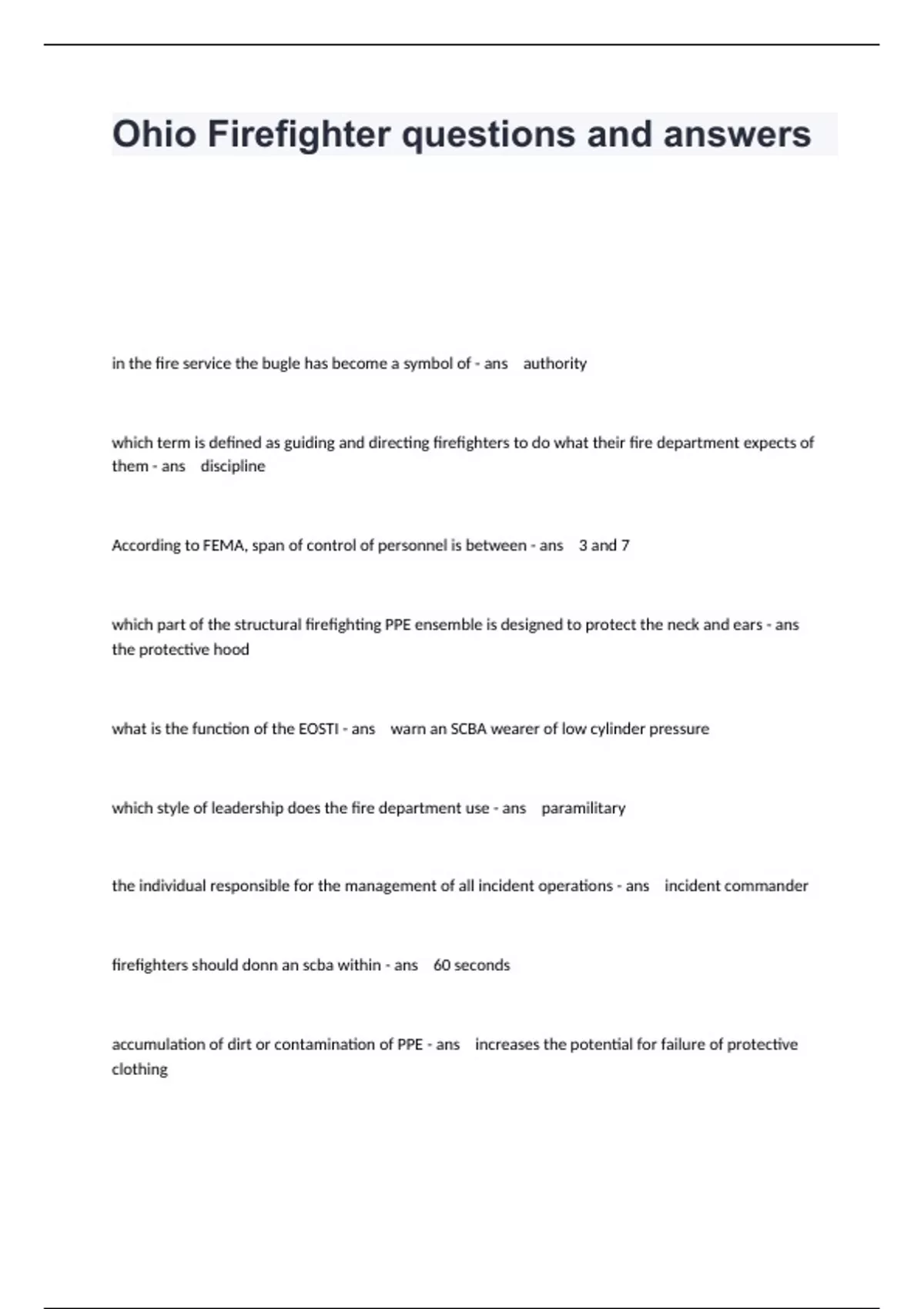 in the fire service the bugle has become a symbol of - ans authority which term is defined as guiding and directing firefighters to do what their fire department expects of them - ans discipline According to FEMA, span of control of personnel is between - ans 3 and 7 which part of the structural firefighting PPE ensemble is designed to protect the neck and ears - ans the protective hood what is the function of the EOSTI - ans warn an SCBA wearer of low cylinder pressure which style of leadership does the fire department use - ans paramilitary the individual responsible for the management of all incident operations - ans incident commander firefighters should donn an scba within - ans 60 seconds accumulation of dirt or contamination of PPE - ans increases the potential for failure of protective clothing