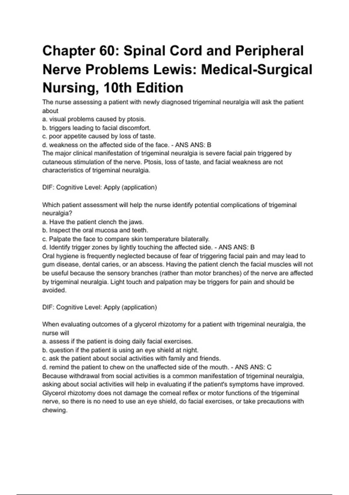 Chapter 60: Spinal Cord and Peripheral Nerve Problems Lewis: Medical-Surgical Nursing, 10th Edition The nurse assessing a patient with newly diagnosed trigeminal neuralgia will ask the patient about a. visual problems caused by ptosis. b. triggers leading to facial discomfort. c. poor appetite caused by loss of taste. d. weakness on the affected side of the face. - ANS ANS: B The major clinical manifestation of trigeminal neuralgia is severe facial pain triggered by cutaneous stimulation of the nerve. Ptosis, loss of taste, and facial weakness are not characteristics of trigeminal neuralgia. DIF: Cognitive Level: Apply (application) Which patient assessment will help the nurse identify potential complications of trigeminal neuralgia? a. Have the patient clench the jaws. b. Inspect the oral mucosa and teeth. c. Palpate the face to compare skin temperature bilaterally. d. Identify trigger zones by lightly touching the affected side. - ANS ANS: B Oral hygiene is frequently neglected because of fear of triggering facial pain and may lead to gum disease, dental caries, or an abscess. Having the patient clench the facial muscles will not be useful because the sensory branches (rather than motor branches) of the nerve are affected by trigeminal neuralgia. Light touch and palpation may be triggers for pain and should be avoided. DIF: Cognitive Level: Apply (application) When evaluating outcomes of a glycerol rhizotomy for a patient with trigeminal neuralgia, the nurse will a. assess if the patient is doing daily facial exercises. b. question if the patient is using an eye shield at night.