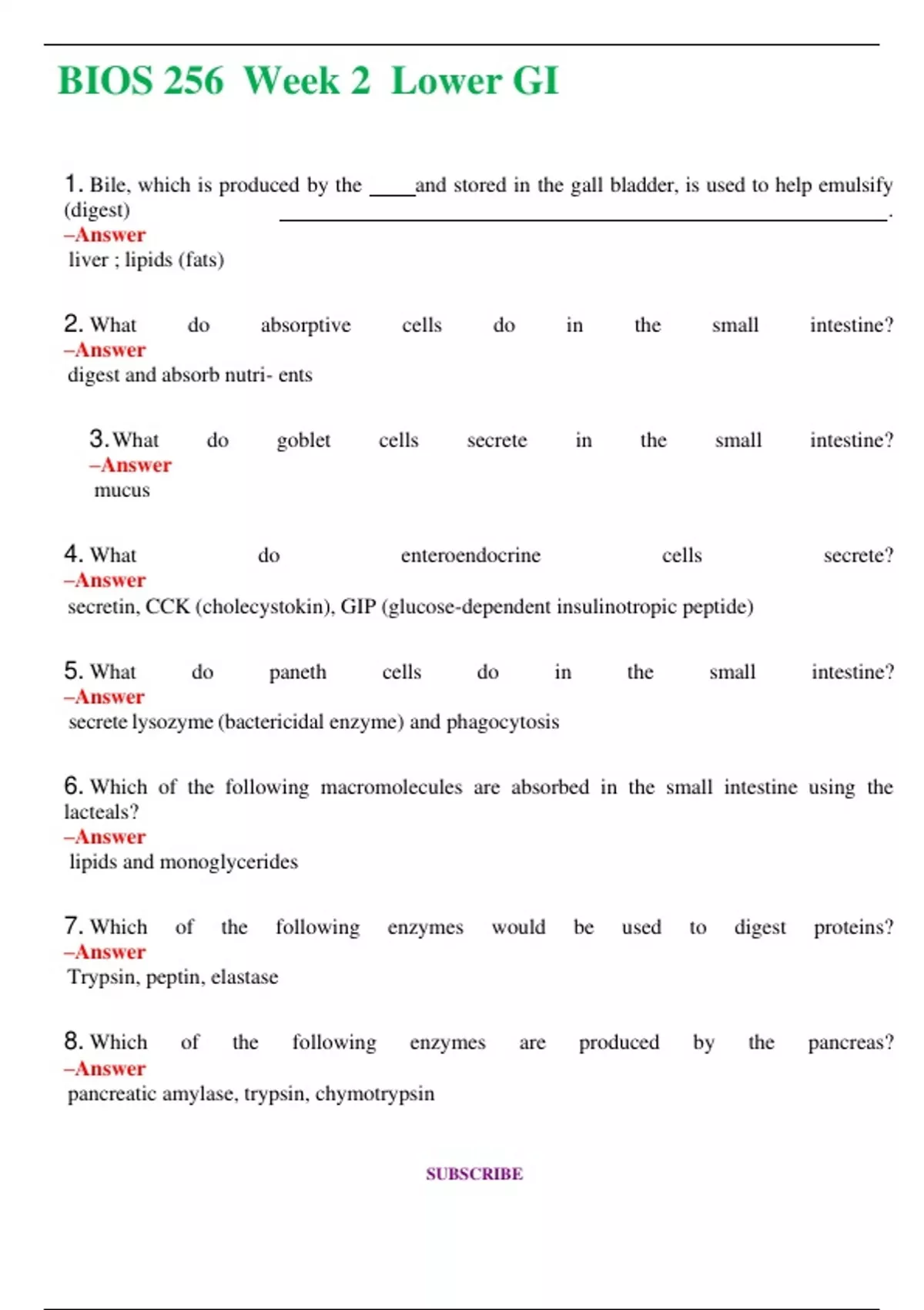 BIOS 256 Week 2 Lower GI (Latest 2024 / 2025) Questions and Answers (Verified Answers)