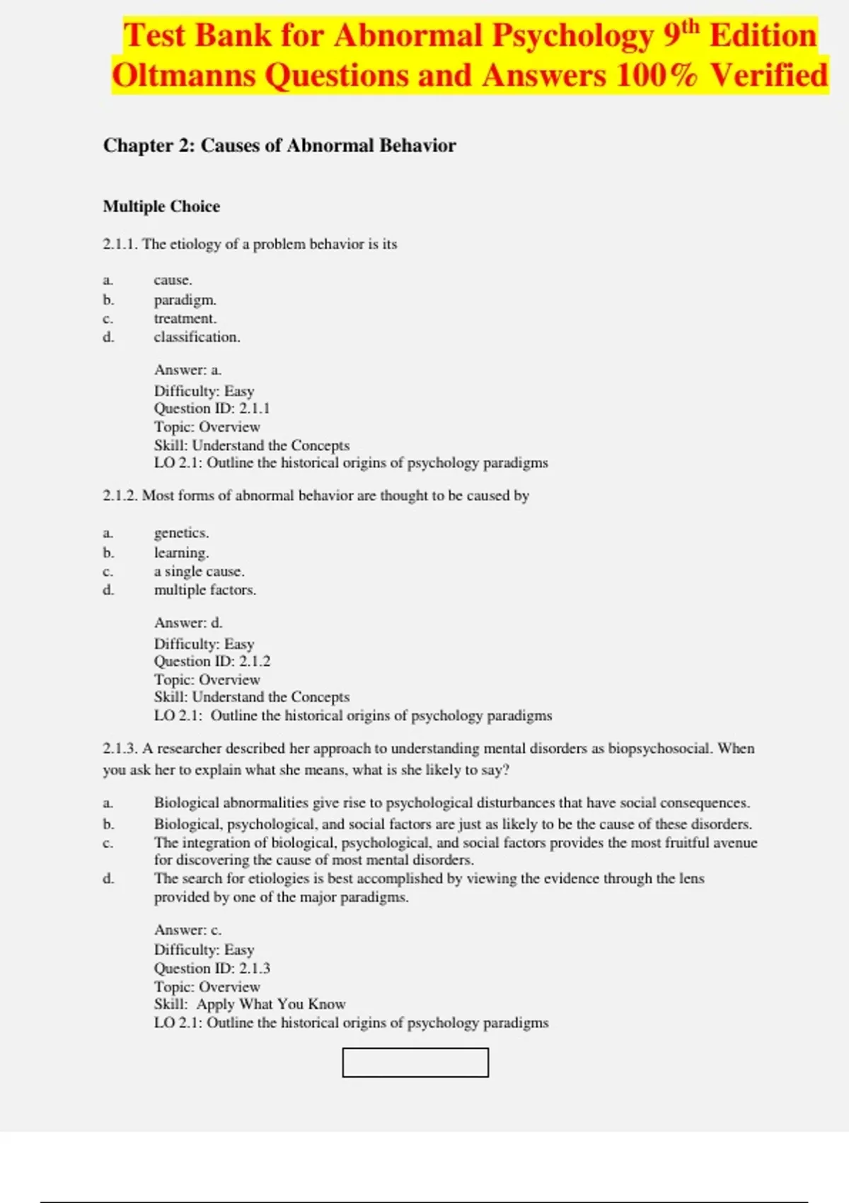 Test Bank for Abnormal Psychology 9th Edition Oltmanns Questions and Answers 100% Verified
