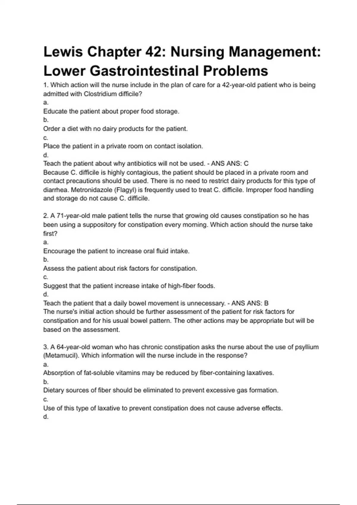 Lewis Chapter 42: Nursing Management: Lower Gastrointestinal Problems (With Correct Solutions) 1. Which action will the nurse include in the plan of care for a 42-year-old patient who is being admitted with Clostridium difficile? a. Educate the patient about proper food storage. b. Order a diet with no dairy products for the patient. c. Place the patient in a private room on contact isolation. d. Teach the patient about why antibiotics will not be used. - ANS ANS: C Because C. difficile is highly contagious, the patient should be placed in a private room and contact precautions should be used. There is no need to restrict dairy products for this type of diarrhea. Metronidazole (Flagyl) is frequently used to treat C. difficile. Improper food handling and storage do not cause C. difficile. 2. A 71-year-old male patient tells the nurse that growing old causes constipation so he has been using a suppository for constipation every morning. Which action should the nurse take first? a. Encourage the patient to increase oral fluid intake. b. Assess the patient about risk factors for constipation. c. Suggest that the patient increase intake of high-fiber foods. d. Teach the patient that a daily bowel movement is unnecessary. - ANS ANS: B The nurse's initial action should be further assessment of the patient for risk factors for constipation and for his usual bowel pattern. The other actions may be appropriate but will be based on the assessment.
