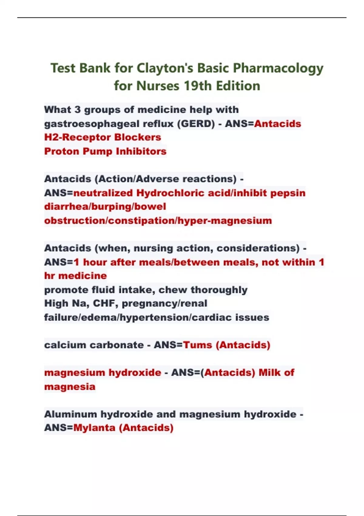 Test Bank for Clayton's Basic Pharmacology for Nurses 19th Edition What 3 groups of medicine help with gastroesophageal reflux (GERD) - ANS=Antacids H2-Receptor Blockers Proton Pump Inhibitors Antacids (Action/Adverse reactions) - ANS=neutralized Hydrochloric acid/inhibit pepsin diarrhea/burping/bowel obstruction/constipation/hyper-magnesium Antacids (when, nursing action, considerations) - ANS=1 hour after meals/between meals, not within 1 hr medicine promote fluid intake, chew thoroughly High Na, CHF, pregnancy/renal failure/edema/hypertension/cardiac issues calcium carbonate - ANS=Tums (Antacids) magnesium hydroxide - ANS=(Antacids) Milk of magnesia Aluminum hydroxide and magnesium hydroxide - ANS=Mylanta (Antacids) sodium bicarbonate - ANS=baking soda (Antacids Anti-Diarrheals Mode of action - ANS=Reduce fluid content of the stool and decrease the peristalsis and motility of the intestinal tract Anti-Diarrheals Side Effects - ANS=Abdominal pain constipation dizziness, nausea and vomiting bismuth subsalicylate (what is it? brand name/considerations) - ANS=Pepto-Bismol Contains salicylates (Reyes syndrome) temporary darkening of stool Diphenoxylate and atropine sulfate - ANS=Lomotil (Anti-Diarrheal) loperamide - ANS=Imodium (Anti-Diarrheal) Kaolin and pectin - ANS=Colace (Anti-Diarrheal) What are the 3 general types of laxatives (common side effects) - ANS=Bulk-forming agents Hyperosmolar or Saline solutions Stimulant or irritant laxatives Side effects: Nausea/vomiting/obstruction/hypersensitivity/crampi ng/diarrhea/electrolytes Bulk Forming laxatives (action/side effects) - ANS=absorb water and expand increase bulk and moisture which increases peristalsis and softens stool Not within 2 hours of other med
