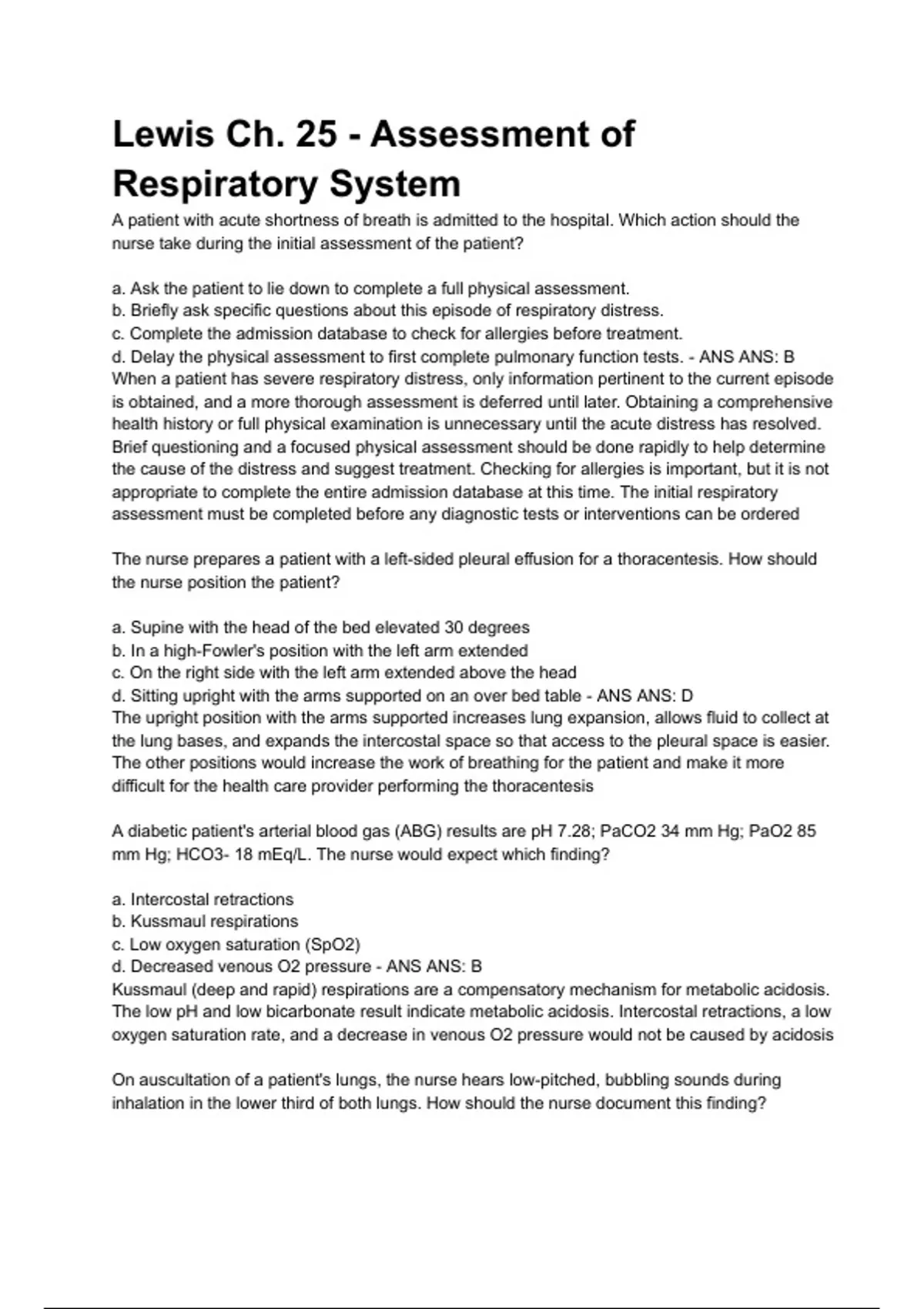 Lewis Ch. 25 - Assessment of Respiratory System A patient with acute shortness of breath is admitted to the hospital. Which action should the nurse take during the initial assessment of the patient? a. Ask the patient to lie down to complete a full physical assessment. b. Briefly ask specific questions about this episode of respiratory distress. c. Complete the admission database to check for allergies before treatment. d. Delay the physical assessment to first complete pulmonary function tests. - ANS ANS: B When a patient has severe respiratory distress, only information pertinent to the current episode is obtained, and a more thorough assessment is deferred until later. Obtaining a comprehensive health history or full physical examination is unnecessary until the acute distress has resolved. Brief questioning and a focused physical assessment should be done rapidly to help determine the cause of the distress and suggest treatment. Checking for allergies is important, but it is not appropriate to complete the entire admission database at this time. The initial respiratory assessment must be completed before any diagnostic tests or interventions can be ordered The nurse prepares a patient with a left-sided pleural effusion for a thoracentesis. How should the nurse position the patient? a. Supine with the head of the bed elevated 30 degrees b. In a high-Fowler's position with the left arm extended c. On the right side with the left arm extended above the head d. Sitting upright with the arms supported on an over bed table - ANS ANS: D The upright position with the arms supported increases lung expansion, allows fluid to collect at the lung bases, and expands the intercostal space so that access to the pleural space is easier. The other positions would increase the work of breathing for the patient and make it more