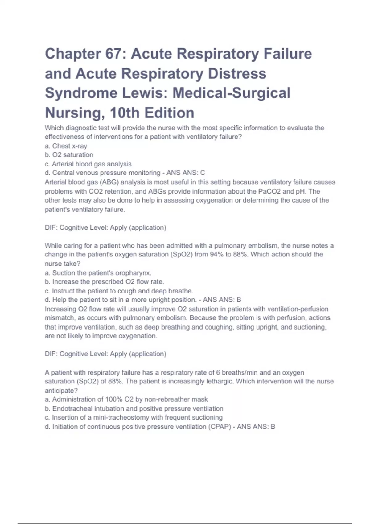 Chapter 67: Acute Respiratory Failure and Acute Respiratory Distress Syndrome Lewis: Medical-Surgical Nursing, 10th Edition Which diagnostic test will provide the nurse with the most specific information to evaluate the effectiveness of interventions for a patient with ventilatory failure? a. Chest x-ray b. O2 saturation c. Arterial blood gas analysis d. Central venous pressure monitoring - ANS ANS: C Arterial blood gas (ABG) analysis is most useful in this setting because ventilatory failure causes problems with CO2 retention, and ABGs provide information about the PaCO2 and pH. The other tests may also be done to help in assessing oxygenation or determining the cause of the patient's ventilatory failure. DIF: Cognitive Level: Apply (application) While caring for a patient who has been admitted with a pulmonary embolism, the nurse notes a change in the patient's oxygen saturation (SpO2) from 94% to 88%. Which action should the nurse take? a. Suction the patient's oropharynx. b. Increase the prescribed O2 flow rate. c. Instruct the patient to cough and deep breathe. d. Help the patient to sit in a more upright position. - ANS ANS: B Increasing O2 flow rate will usually improve O2 saturation in patients with ventilation-perfusion mismatch, as occurs with pulmonary embolism. Because the problem is with perfusion, actions that improve ventilation, such as deep breathing and coughing, sitting upright, and suctioning, are not likely to improve oxygenation. DIF: Cognitive Level: Apply (application) A patient with respiratory failure has a respir