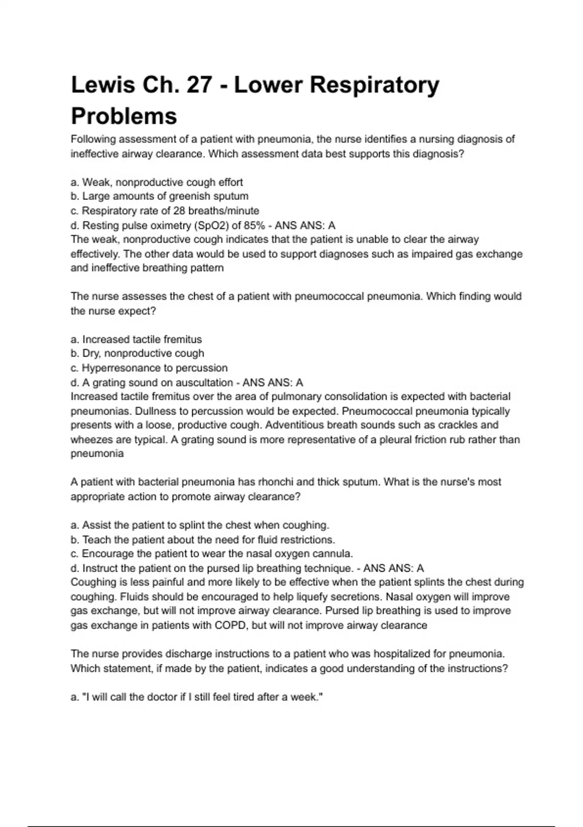 Lewis Ch. 27 - Lower Respiratory Problems Following assessment of a patient with pneumonia, the nurse identifies a nursing diagnosis of ineffective airway clearance. Which assessment data best supports this diagnosis? a. Weak, nonproductive cough effort b. Large amounts of greenish sputum c. Respiratory rate of 28 breaths/minute d. Resting pulse oximetry (SpO2) of 85% - ANS ANS: A The weak, nonproductive cough indicates that the patient is unable to clear the airway effectively. The other data would be used to support diagnoses such as impaired gas exchange and ineffective breathing pattern The nurse assesses the chest of a patient with pneumococcal pneumonia. Which finding would the nurse expect? a. Increased tactile fremitus b. Dry, nonproductive cough c. Hyperresonance to percussion d. A grating sound on auscultation - ANS ANS: A Increased tactile fremitus over the area of pulmonary consolidation is expected with bacterial pneumonias. Dullness to percussion would be expected. Pneumococcal pneumonia typically presents with a loose, productive cough. Adventitious breath sounds such as crackles and wheezes are typical. A grating sound is more representative of a pleural friction rub rather than pneumonia