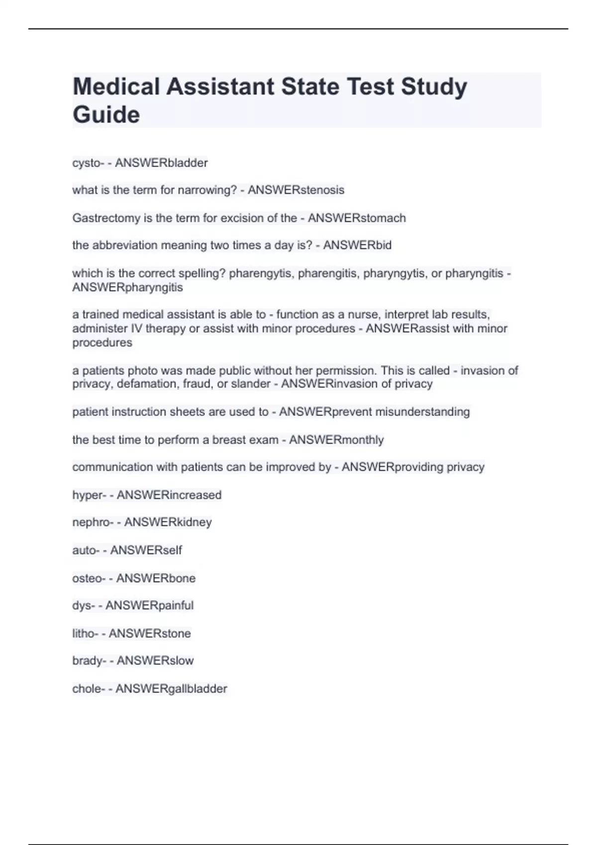 Medical Assistant State Test Study Guide.Finishes with questions and solutions 2024