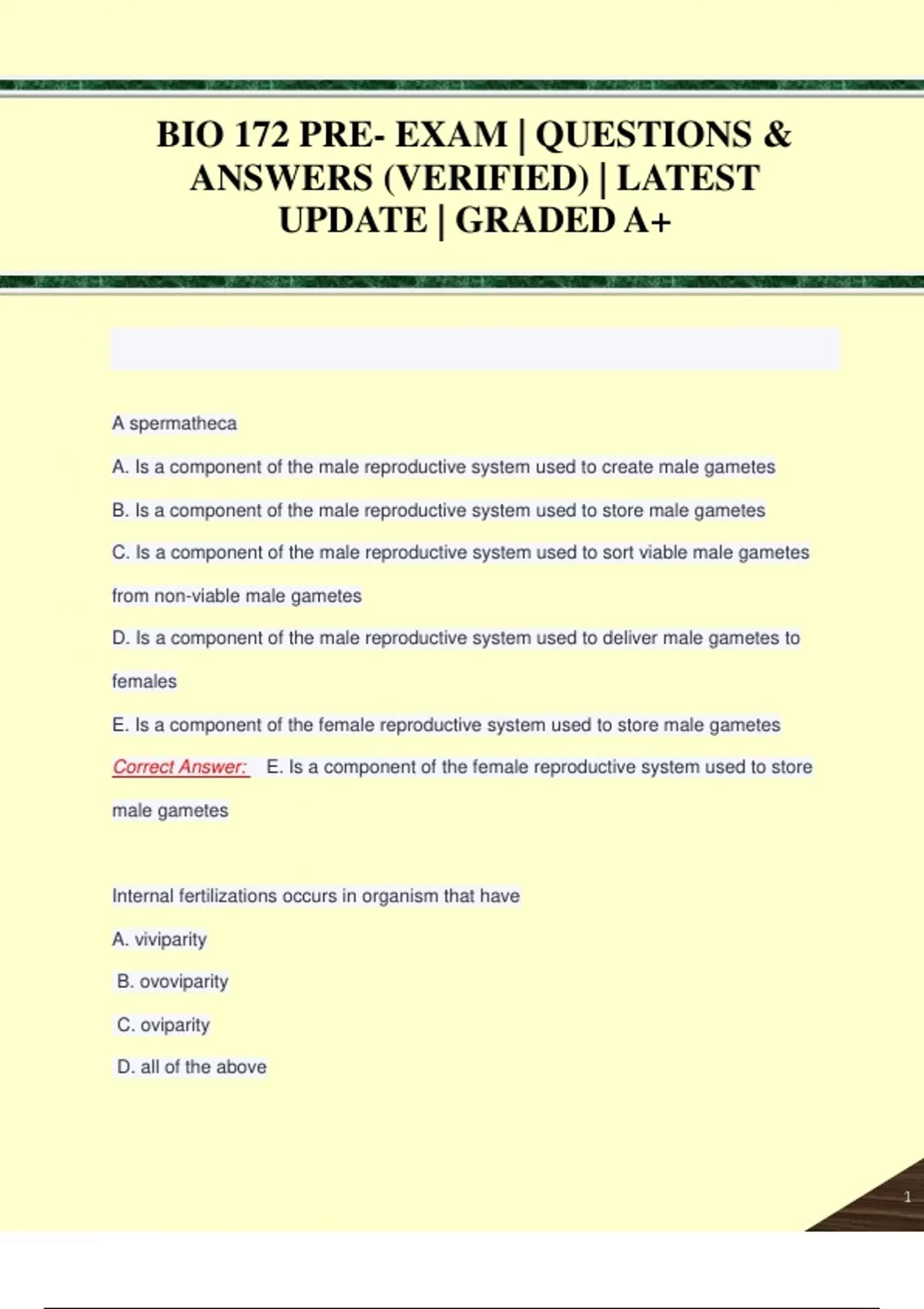 BIO 172 PRE- EXAM | QUESTIONS & ANSWERS (VERIFIED) | LATEST UPDATE | GRADED A+ BIO 172 PRE- EXAM | QUESTIONS & ANSWERS (VERIFIED) | LATEST UPDATE | GRADED A+