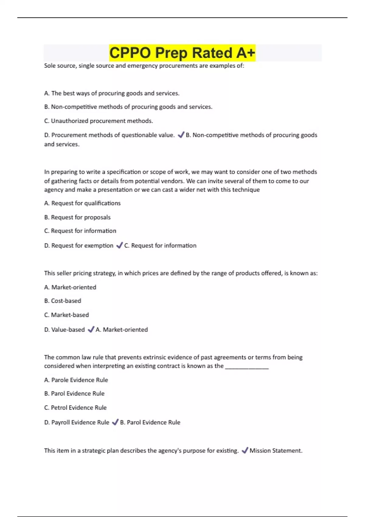 CPPO Prep Rated A+ Sole source, single source and emergency procurements are examples of: A. The best ways of procuring goods and services. B. Non-competitive methods of procuring goods and services. C. Unauthorized procurement methods. D. Procurement methods of questionable value. and services. B. Non-competitive methods of procuring goods In preparing to write a specification or scope of work, we may want to consider one of two methods of gathering facts or details from potential vendors. We can invite several of them to come to our agency and make a presentation or we can cast a wider net with this technique A. Request for qualifications B. Request for proposals C. Request for information D. Request for exemption C. Request for information This seller pricing strategy, in which prices are defined by the range of products offered, is known as: A. Market-oriented B. Cost-based C. Market-based D. Value-based A. Market-oriented The common law rule that prevents extrinsic evidence of past agreements or terms from being considered when interpreting an existing contract is known as the _____________ A. Parole Evidence Rule B. Parol Evidence Rule C. Petrol Evidence Rule D. Payroll Evidence Rule B. Parol Evidence Rule This item in a strategic plan describes the agency's purpose for existing. Mission Statement. Why is the Request for Proposal (RFP) process often perceived as problematic by an agency's leadership? A. The award decision is very quantifiable. B. The award decision is based on qualitative variables. C. The price is rarely known on award. D. The outcome of the RFP process is difficult to justify. qualitative variables. B. The award decision is based on A university is prepared to sign a contract to add 10 classrooms for a new program. Registration for the program will begin in 9 months if the project is completed on time and 6 months if the contractor completes the project early. During the negotiations, the university offered the contractor an additional $50,000 to complete the project in six months. What type of contract pricing is the university using? A. Fixed-price with redetermination B. Fixed-price incentive C. Cost sharing D. Cost plus fixed fee B. Fixed-price incentive Laws governing public records, open meetings and freedom of information are known by this illuminating phrase. The Sunshine Law Which of the following analysis methods looks at the availability of competition and alternative products? A. Demand analysis B. Market analysis C. Supplier analysis D. Value analysis C. Supplier analysis The ABA Model Procurement Code lists six methods of source selection Competitive Sealed Proposals Small Purchases Sole Source Procurement Emergency Procurement Competitive Sealed Bids Competitive Selection for Services or Architect-Engineer and Land Surveying Services. Unity of command; equality of authority & responsibility; and span of control & delegation are three essential principles of which aspect of management? A. Staffing B. Planning C. Directing D. Organizing D. Organizing Strategies identify methods to achieve specific goals. Goals identify what the organization wants to achieve and objectives identify... A. When the goals will be carried out. B. Where the goals will take place. C. How the goals are to be carried out. D. How the goals will improve the budget. C. How the goals are to be carried out. Which of the following is an alternative to using bidder/sourcing lists? A. Pre-qualification of vendors. B. Past qualification of vendors. C. Sole source purchasing D. Electronic bid boards D. Electronic bid boards 1. Good negotiated agreements are based on: A. The interests of both parties B. A balance of power C. The positions of both parties D. Good friendships between the parties A. The interests of both parties In the risk control element of risk management, what is the difference between avoidance and loss control? Give an example, if necessary. Risk avoidance is a conscious decision not to expose the entity to a particular risk of loss. Loss Control is making a loss less likely to occur and less damaging when they do occur. What part of public contracting law does "collusion" represent? A. Administrative Law B. Law of Agency C. Tort Law D. Criminal Law D. Criminal Law Internal resistance, current crisis and political windows are all limitations primarily of: A. Creating good solicitations B. Planning C. Changing our procurement rules D. Conducting RFP evaluations B. Planning 1. When procurement folks claim that we add value to the process of obtaining needed goods and services, that means: A. We do more than just issue solicitations. B. We use value analysis techniques exclusively. C. Our services are more valuable than other departments in the organization. D. The dollar value of what we buy is the most important criteria by which to judge us. more than just issue solicitations. A. We do 1. There are six delays listed in the literature that are considered non-excusable when it comes to contract performance. Financial Difficulties Lack of Materials Labor Problems, excluding strikes Lack of Equipment and Facilities Lack of Knowledge Reasonable Delays preceding award Express, implied, inherent and apparent are all types of: A. Warranties B. FOB delivery terms C. Authority D. Contracts C. Authority Constructive suspensions occur when a public agency is found to be responsible for a work stoppage and yet they did not actually issue a suspension of work to the contractor. There are seven examples noted in the literature Agency Convenience, Funding Delays, Delays that include issuance of the notice to proceed Delays that include issuance of change orders, Site Availability, Inspection, Approvals