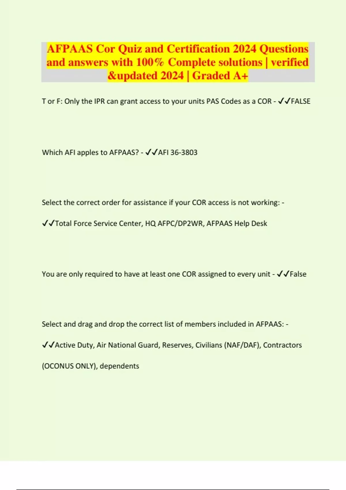 AFPAAS Cor Quiz and Certification 2024 Questions and answers with 100% Complete solutions | verified &updated 2024 | Graded A+ T or F: Only the IPR can grant access to your units PAS Codes as a COR - FALSE Which AFI apples to AFPAAS? - AFI 36-3803 Select the correct order for assistance if your COR access is not working: - Total Force Service Center, HQ AFPC/DP2WR, AFPAAS Help Desk You are only required to have at least one COR assigned to every unit - False Select and drag and drop the correct list of members included in AFPAAS: - Active Duty, Air National Guard, Reserves, Civilians (NAF/DAF), Contractors (OCONUS ONLY), dependents Only the HQ Air Staff can direct AFPAAS Events - False