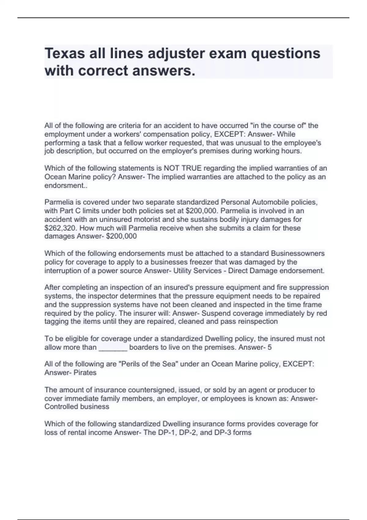 Texas all lines adjuster exam questions with correct answers