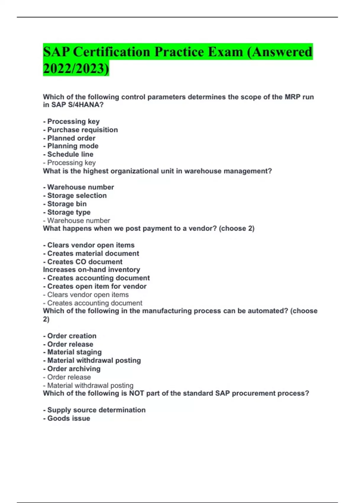 SAP Certification Practice Exam (Answered 2022/2023) Which of the following control parameters determines the scope of the MRP run in SAP S/4HANA? - Processing key - Purchase requisition - Planned order - Planning mode - Schedule line - Processing key What is the highest organizational unit in warehouse management? - Warehouse number - Storage selection - Storage bin - Storage type - Warehouse number What happens when we post payment to a vendor? (choose 2) - Clears vendor open items - Creates material document - Creates CO document Increases on-hand inventory - Creates accounting document - Creates open item for vendor - Clears vendor open items - Creates accounting document Which of the following in the manufacturing process can be automated? (choose 2) - Order creation - Order release - Material staging - Material withdrawal posting - Order archiving - Order release - Material withdrawal posting Which of the following is NOT part of the standard SAP procurement process? - Supply source determination - Goods issue - Invoice verification - Purchase order monitoring - Goods issue Select all HCM organizational objects: (choose 4) - Payroll area - Org unit - Persons - Employee self-service - Job - Position - Compensation - Org unit - Persons - Job - Position What is true of S/4HANA? (choose 4) - Multicore processors - Can run on any database platform - Row based data model - Big memory - Mandatory to use the material ledger - Business users must use Fiori - Multi processors - Big memory - Mandatory to use the material ledger - Business users must use Fiori In SAP S4/HANA, the SOP (Sales Operations Planning) is being replaced with which process? - COPA planning (COPA) - Production Planning (PP) - Integrated Business Planning (IBP) - Material Requirements Planning (MRP) - Integrated Business Planning (IBP) What process in EWM is used for determining the best storage bin for a material? - Picking - Stock transfer - Slotting - Goods receipt - Slotting The employee master data is stored on objects called: - Personnel file - InfoType - Personnel action - Positions - InfoType List the first four procure to pay steps in the correct order: - Create the PO, Determine Requirements, Determine source of supply, Select the vendor - Determine requirements, Select the vendor, Determine source of supply, Create the PO - Determine Requirements, Determine source of supply, Select the vendor, Create the PO - Determine source of supply, Determine Requirements, Select the vendor, Create the PO - Determine Requirements, Determine source of supply, Select the vendor, Create the PO What is the hierarchy of major project steps? - Activities - Tasks - Project plan - WBS - Network - WBS What is an output of MRP? (choose 2) - Purchase order - Sales order - Planned order - Purchase requisition - Quotation - Planned order - Purchase requisition A profit center cannot be assigned to which of the following? - Asset - Material - Cost Center - G/L Account - G/L Account Assessments for statistical key figures are achieved with which type of G/L Account? - Primary Cost Element - Non-Operating - Balance Sheet Account - Secondary Cost Element - Secondary Cost Element What is true about secondary cost elements? (choose 2) - Created in CO - Used for allocations - Created in FI - Used for analysis only - Used for allocations - Created in FI What does the material type determine? (choose 2) - The strategy group assigned to the material - Views displayed for maintaining the material - How the material number is assigned - The MRP type for the material - Views displayed for maintaining the material - How the material number is assigned Which elements are part of a sales area? (choose 2) - Sales organization - Material ledger - Purchasing organization - Distribution channel - Purchasing group - Sales organization - Distribution channel Which of the following are examples of technical objects? (choose 3) - Work centers - BOMs - Functional location - Structure - Equipment - BOMs - Functional location - Equipment Which of the following is a model of hierarchical steps to complete a project? - WBS element - Operative Structure - Network - Activities - WBS element