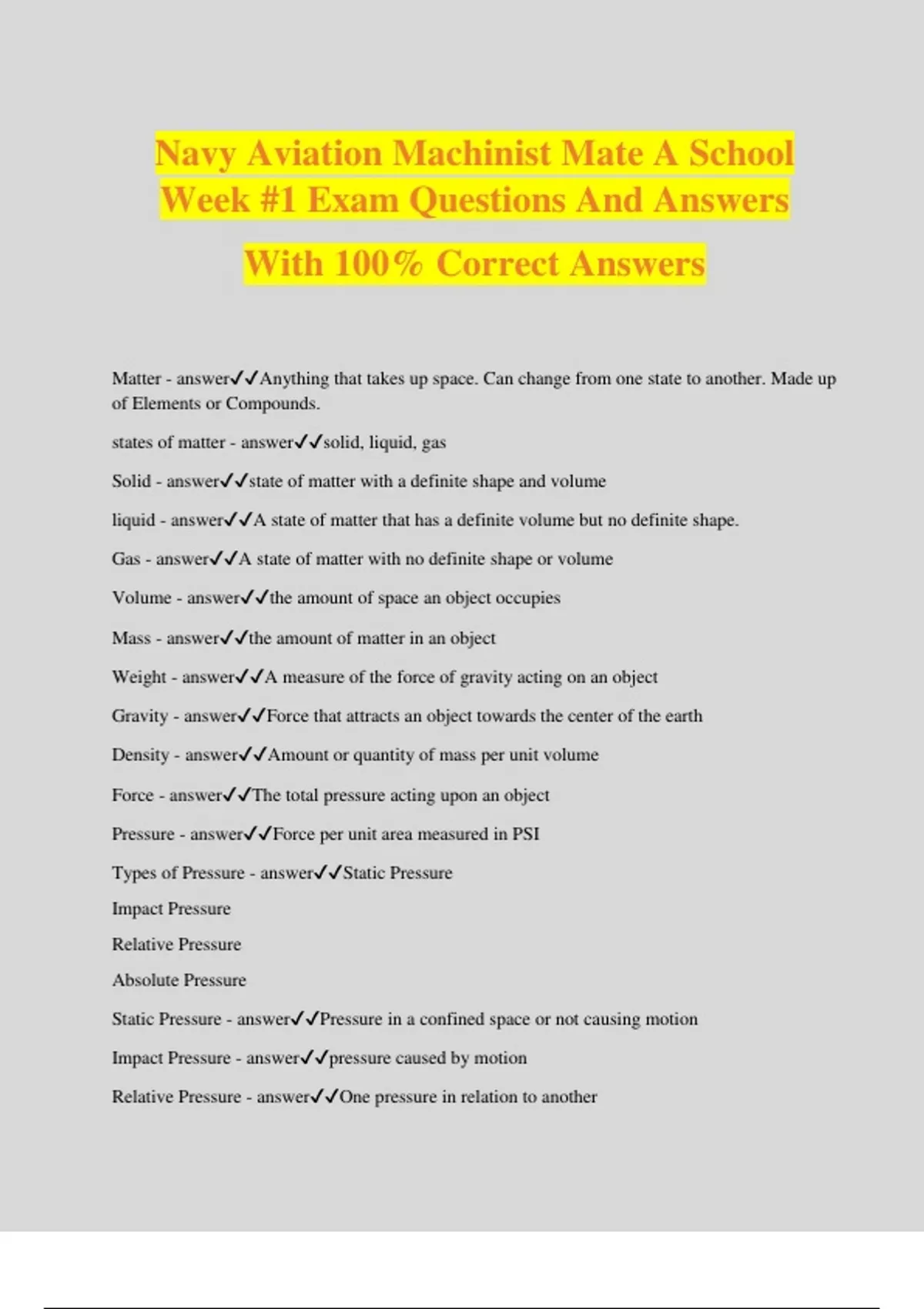 Navy Aviation Machinist Mate A School Week #1 Exam Questions And Answers With 100% Correct Answers Matter - answerAnything that takes up space. Can change from one state to another. Made up of Elements or Compounds. states of matter - answersolid, liquid, gas Solid - answerstate of matter with a definite shape and volume liquid - answerA state of matter that has a definite volume but no definite shape. Gas - answerA state of matter with no definite shape or volume Volume - answerthe amount of space an object occupies Mass - answerthe amount of matter in an object Weight - answerA measure of the force of gravity acting on an object Gravity - answerForce that attracts an object towards the center of the earth Density - answerAmount or quantity of mass per unit volume Force - answerThe total pressure acting upon an object Pressure - answerForce per unit area measured in PSI Types of Pressure - answerStatic Pressure Impact Pressure Relative Pressure Absolute Pressure Static Pressure - answerPressure in a confined space or not causing motion Impact Pressure - answerpressure caused by motion Relative Pressure - answerOne pressure in relation to another Absolute Pressure - answerSum of the Atmospheric Pressure and System pressure starting from a theoretical vacuum Pascal's Law - answerPressure applied to enclosed or confined fluid is transmitted equally in all directions without loss, and acts with equal force on all surfaces. Bernoulli's Principle - answerStates whenever a stream of any fluid has it's velocity increase at a given point the pressure of the stream at that given point is less than the rest of the stream. Divergent Venturi tube - answerDecrease velocity and increase pressure Convergent Venturi tube - answerincrease velocity and decrease pr
