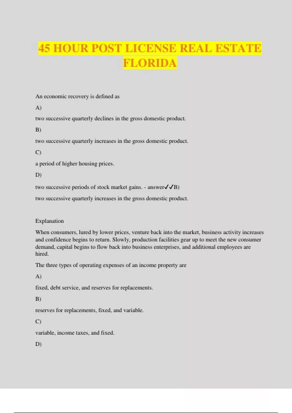 45 HOUR POST LICENSE REAL ESTATE FLORIDA An economic recovery is defined as A) two successive quarterly declines in the gross domestic product. B) two successive quarterly increases in the gross domestic product. C) a period of higher housing prices. D) two successive periods of stock market gains. - answerB) two successive quarterly increases in the gross domestic product. Explanation When consumers, lured by lower prices, venture back into the market, business activity increases and confidence begins to return. Slowly, production facilities gear up to meet the new consumer demand, capital begins to flow back into business enterprises, and additional employees are hired. The three types of operating expenses of an income property are A) fixed, debt service, and reserves for replacements. B) reserves for replacements, fixed, and variable. C) variable, income taxes, and fixed. D) reserves for replacements, variable, and income taxes. - answerB) reserves for replacements, fixed, and variable. Explanation Operating expenses are divided into three categories: fixed expenses, variable expenses, and reserves for replacement. A person applies for a $300,000, 30-year fixed-rate mortgage loan at 4%. The mortgage payment factor is .. Taxes for the year are $4,000, and insurance is $2,400. Her monthly payment for principal, interest, taxes, and insurance (PITI) will be A) $1,432.25. B) $1,773.64. C) $1,273.64. D) $1,965.58. - answerD) $1,965.58. 58. $300,000 × . = $1,432.25 principal and interest. $4,000 taxes ÷ 12 months = 333.33. $2,400 insurance ÷ 12 months = 200. $1,432.25 + $333.33 + $200 = $1,965.58 total PITI. A sales associate receives a good-faith deposit from a buyer on Wednesday. The broker must deposit the funds into the escrow account no later than the following A) Tuesday. B) Monday. C) Thursday. D) Friday. - answerB) Monday. FREC rules require that the sales associate must give the broker the funds within one business day. The broker must deposit the funds in a bank within three business days. The minimum legal description for a platted subdivision would include A) street address, lot and block number, and subdivision name. B) county, lot and block number, name of subdivision, and lot dimensions. C) subdivision name, county, reference to section, township, and range. D) subdivision name, county, lot and block number, plat book and page number. - answerD) subdivision name, county, lot and block number, plat book and page number. Antitrust laws A) allow brokers to boycott cut-rate brokers' listings. B) prohibit commercial advertising in faxes. C) allow brokers to split up market areas. D) prohibit price fixing. - answerD)