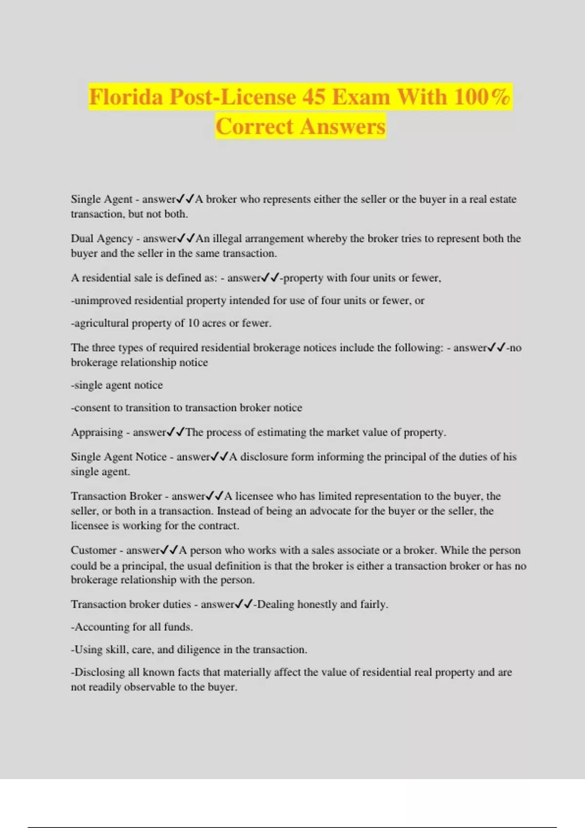 Florida Post-License 45 Exam With 100% Correct Answers Single Agent - answerA broker who represents either the seller or the buyer in a real estate transaction, but not both. Dual Agency - answerAn illegal arrangement whereby the broker tries to represent both the buyer and the seller in the same transaction. A residential sale is defined as: - answer-property with four units or fewer, -unimproved residential property intended for use of four units or fewer, or -agricultural property of 10 acres or fewer. The three types of required residential brokerage notices include the following: - answer-no brokerage relationship notice -single agent notice -consent to transition to transaction broker notice Appraising - answerThe process of estimating the market value of property. Single Agent Notice - answerA disclosure form informing the principal of the duties of his single agent. Transaction Broker - answerA licensee who has limited representation to the buyer, the seller, or both in a transaction. Instead of being an advocate for the buyer or the seller, the licensee is working for the contract. Customer - answerA person who works with a sales associate or a broker. While the person could be a principal, the usual definition is that the broker is either a transaction broker or has no brokerage relationship with the person. Transaction broker duties - answer-Dealing honestly and fairly. -Accounting for all funds. -Using skill, care, and diligence in the transaction. -Disclosing all known facts that materially affect the value of residential real property and are not readily observable to the buyer. -Presenting all offers and counteroffers in a timely manner, unless a party has previously directed the licensee otherwise in writing. -Limited confidentiality, unless waived in writing by a party. The transaction broker may not reveal to either party:that the seller might accept a price less than the asking or list price,that the buyer might pay a price greater than the price submitted in a written offer,the motivation of any party for selling or buying property,that a seller or a buyer will agree to financing terms other than those offered, andany other information requested by a party to remain confidential. -Any additional duties that are entered into by this or a separate agreement. Principal - answer(1) The person who enters into a fiduciary relationship with a single agent licensee. (2) The amount of money remaining due on a mortgage loan. Fiduciary Relationship - answerA relationship of trust and confidence between an agent and a principal. Singe AGent Duties - answer-Dealing honestly and fairly -Loyalty -Confidentiality -Obedience -Full disclosure -Accounting for all funds -Skill, care, and diligence in the transaction -Presenting all offers and counteroffers in a timely manner, unless a party has previously directed the licensee otherwise in writing -Disclosing all known facts that materially affect the value of residential real property and are not readily observable Buyer Brokerage Agreement - answerAn agreement between a buyer and a broker for the broker to provide services to a buyer for compensation. The broker may be acting as a single agent, a transaction broker, or a nonrepresentative. Consent To Transition To Transaction Broker Notice - answerA disclosure form that allows a single agent to become a transaction broker. The notice must be signed by the principal before the broker can make the change. Fiduciary Relationship - answer-A relationship of trust and confidence between an agent and a principal. -Only single agent relationship creates this Role of Sales Associate - answerSales associates are agents of their registered brokers. If a seller's broker has a listing, that broker and all the sales associates in that firm represent the seller. No brokerage relationship notice - answerA disclosure that must be given by a licensee who does not represent a buyer or a seller before entering into an agreement or showing a property. Need not be signed. no brokerage relationship duties - answer-Dealing honestly and fairly -Disclosing all known facts that materially affect the value of the residential real property that are not readily observable to the buyer -Accounting for all funds entrusted to the licensee No Broker Relationship Example - answerBroker Helen lists the Smiths' home as a single agent. Later, Helen shows it to Mr. Jon