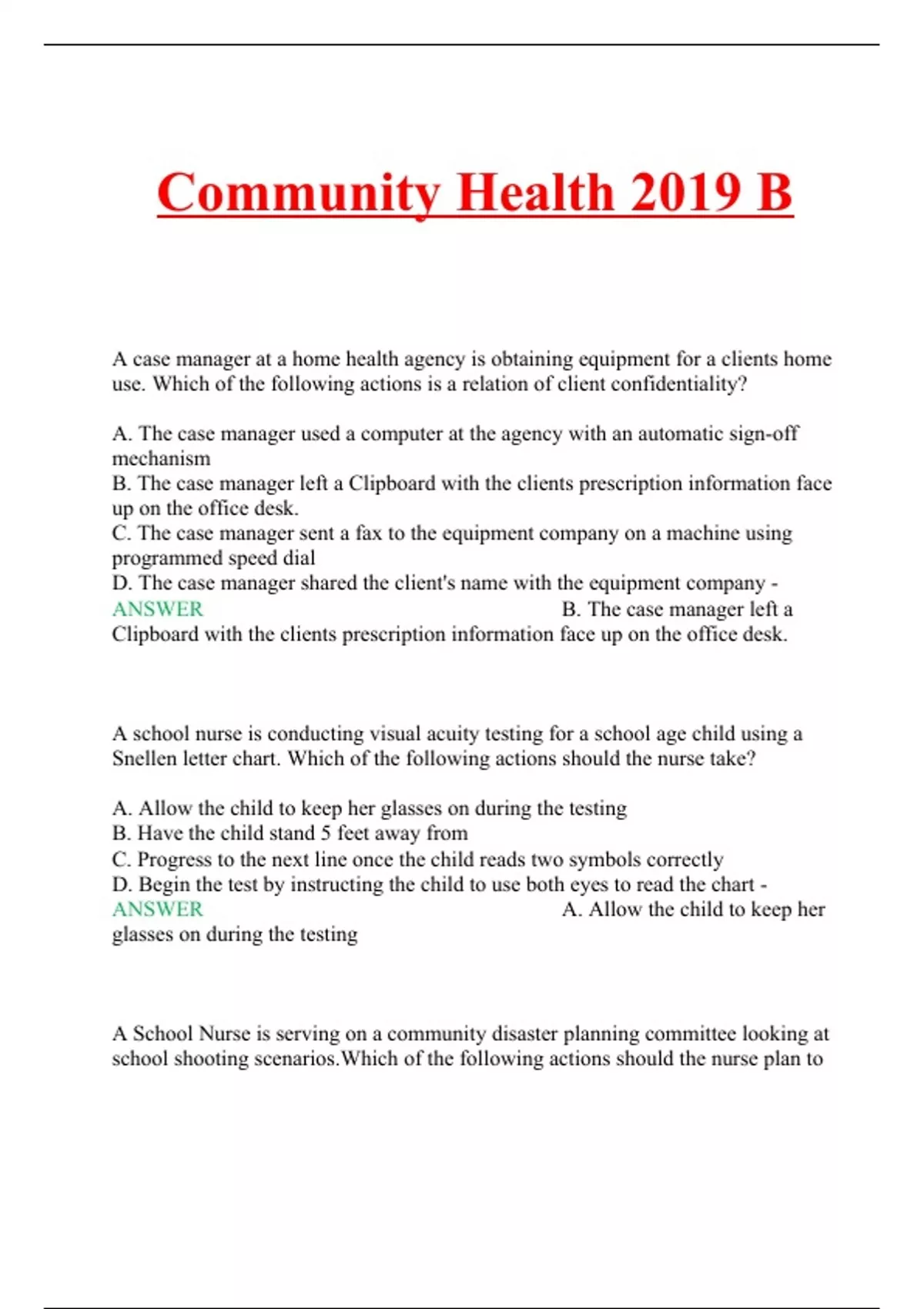 Community Health 2019 B A case manager at a home health agency is obtaining equipment for a clients home use. Which of the following actions is a relation of client confidentiality? A. The case manager used a computer at the agency with an automatic sign-off mechanism B. The case manager left a Clipboard with the clients prescription information face up on the office desk. C. The case manager sent a fax to the equipment company on a machine using programmed speed dial D. The case manager shared the client's name with the equipment company - ANSWER B. The case manager left a Clipboard with the clients prescription information face up on the office desk. A school nurse is conducting visual acuity testing for a school age child using a Snellen letter chart. Which of the following actions should the nurse take? A. Allow the child to keep her glasses on during the testing B. Have the child stand 5 feet away from C. Progress to the next line once the child reads two symbols correctly D. Begin the test by instructing the child to use both eyes to read the chart - ANSWER A. Allow the child to keep her glasses on during the testing A School Nurse is serving on a community disaster planning committee looking at school shooting scenarios.Which of the following actions should the nurse plan to take during the response please? - ANSWER C. Perform triage and provide hands-on care as needed to victims A nurse manager at a community health clinic is presenting an in service for nurses about assessing clients who have experienced violence. Which of the following statements by a nurse indicates an understanding of the teaching? A. "I do not need to ask about violence at future visits once I determine that a client is not at risk." B. "I should not document the name of the person the client accuses of the violence in the client's medical record" C. "I should wait until i see signs of physical violence before i help the client develop a safety plan." D. "I should determine whether a client who has been sexually assaulted requires a rape kit examination." - ANSWER D. "I should determine whether a client who has been sexually assaulted requires a rape kit examination."