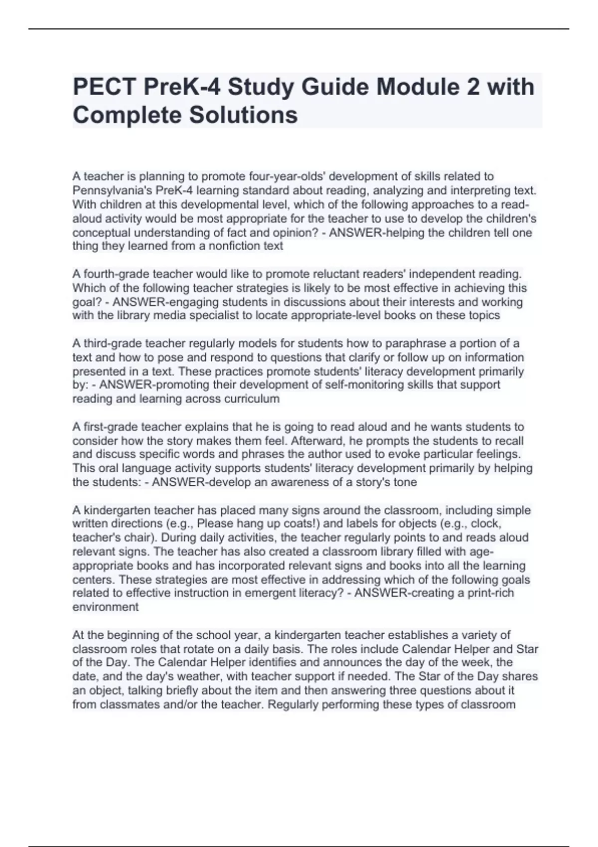 PECT PreK-4 Study Guide Module 2 with Complete SolutionsPECT PreK-4 Study Guide Module 2 with Complete SolutionsPECT PreK-4 Study Guide Module 2 with Complete SolutionsA teacher is planning to promote four-year-olds' development of skills related to Pennsylvania's PreK-4 learning standard about reading, analyzing and interpreting text. With children at this developmental level, which of the following approaches to a read-aloud activity would be most appropriate for the teacher to use to develop the children's conceptual understanding of fact and opinion? - ANSWER-helping the children tell one thing they learned from a nonfiction text A fourth-grade teacher would like to promote reluctant readers' independent reading. Which of the following teacher strategies is likely to be most effective in achieving this goal? - ANSWER-engaging students in discussions about their interests and working with the library media specialist to locate appropriate-level books on these topics A third-grade teacher regularly models for students how to paraphrase a portion of a text and how to pose and respond to questions that clarify or follow up on information presented in a text. These practices promote students' literacy development primarily