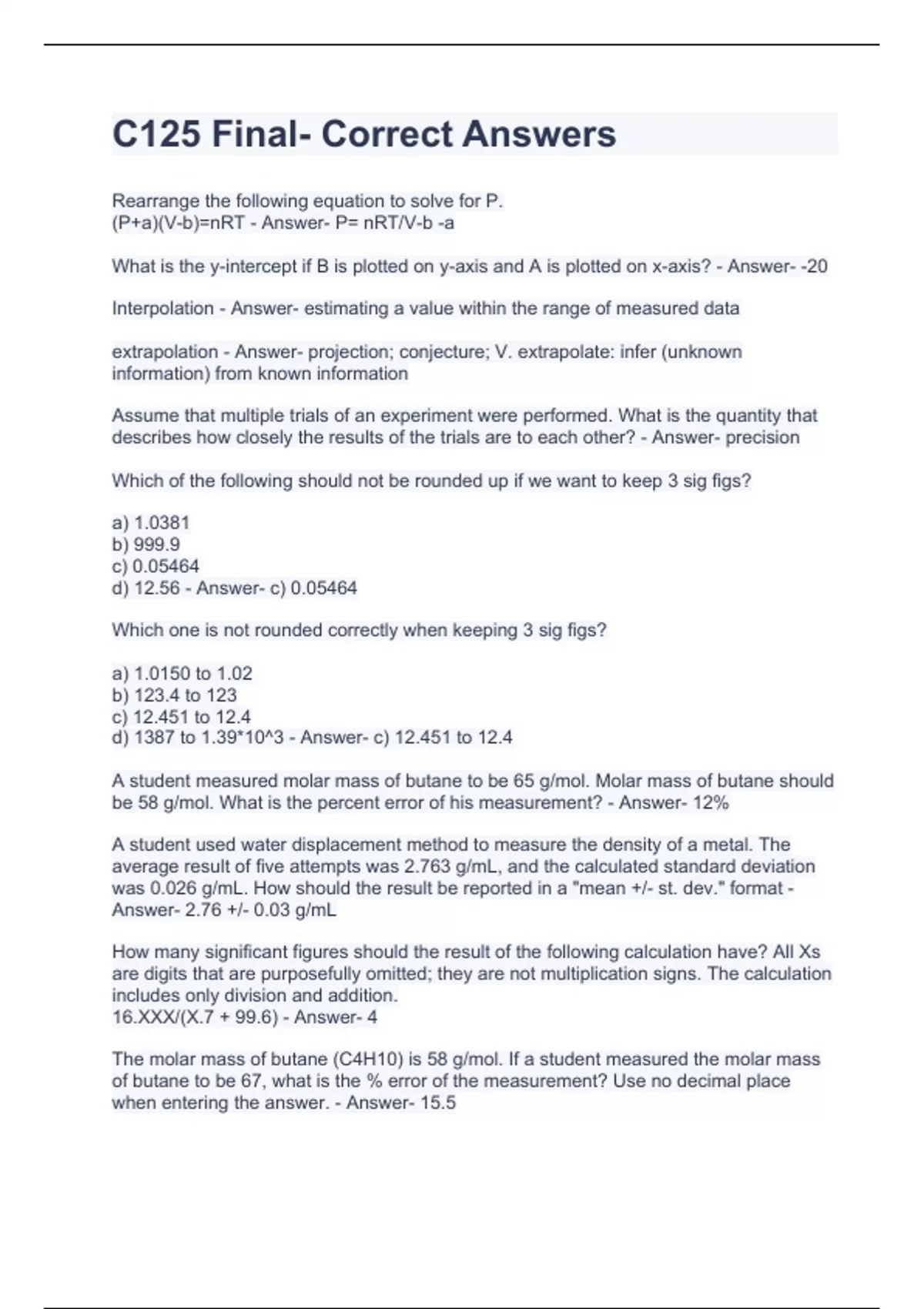 Rearrange the following equation to solve for P. (P+a)(V-b)=nRT - Answer- P= nRT/V-b -a What is the y-intercept if B is plotted on y-axis and A is plotted on x-axis? - Answer- -20 Interpolation - Answer- estimating a value within the range of measured data extrapolation - Answer- projection; conjecture; V. extrapolate: infer (unknown information) from known information Assume that multiple trials of an experiment were performed. What is the quantity that describes how closely the results of the trials are to each other? - Answer- precision Which of the following should not be rounded up if we want to keep 3 sig figs? a) 1.0381 b) 999.9 c) 0.05464 d) 12.56 - Answer- c) 0.05464 Which one is not rounded correctly when keeping 3 sig figs? a) 1.0150 to 1.02 b) 123.4 to 123 c) 12.451 to 12.4 d) 1387 to 1.39*10^3 - Answer- c) 12.451 to 12.4 A student measured molar mass of butane to be 65 g/mol. Molar mass of butane should be 58 g/mol. What is the percent error of his measurement? - Answer- 12% A student used water displacement method to measure the density of a metal. The average result of five attempts was 2.763 g/mL, and the calculated standard deviation was 0.026 g/mL. How should the result be reported in a "mean +/- st. dev." format - Answer- 2.76 +/- 0.03 g/mL How many significant figures should the result of the following calculation have? All Xs are digits that are purposefully omitted; they are not multiplication signs. The calculation includes only division and addition. 16.XXX/(X.7 + 99.6) - Answer- 4