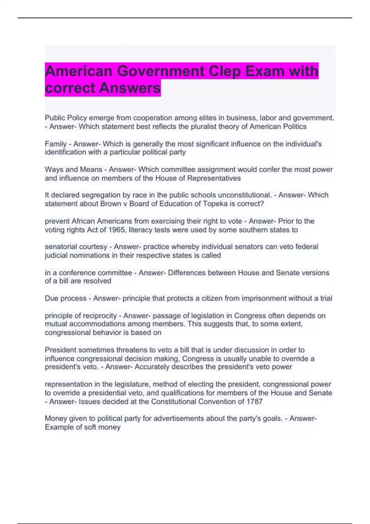 american government clep exam with correct answers
