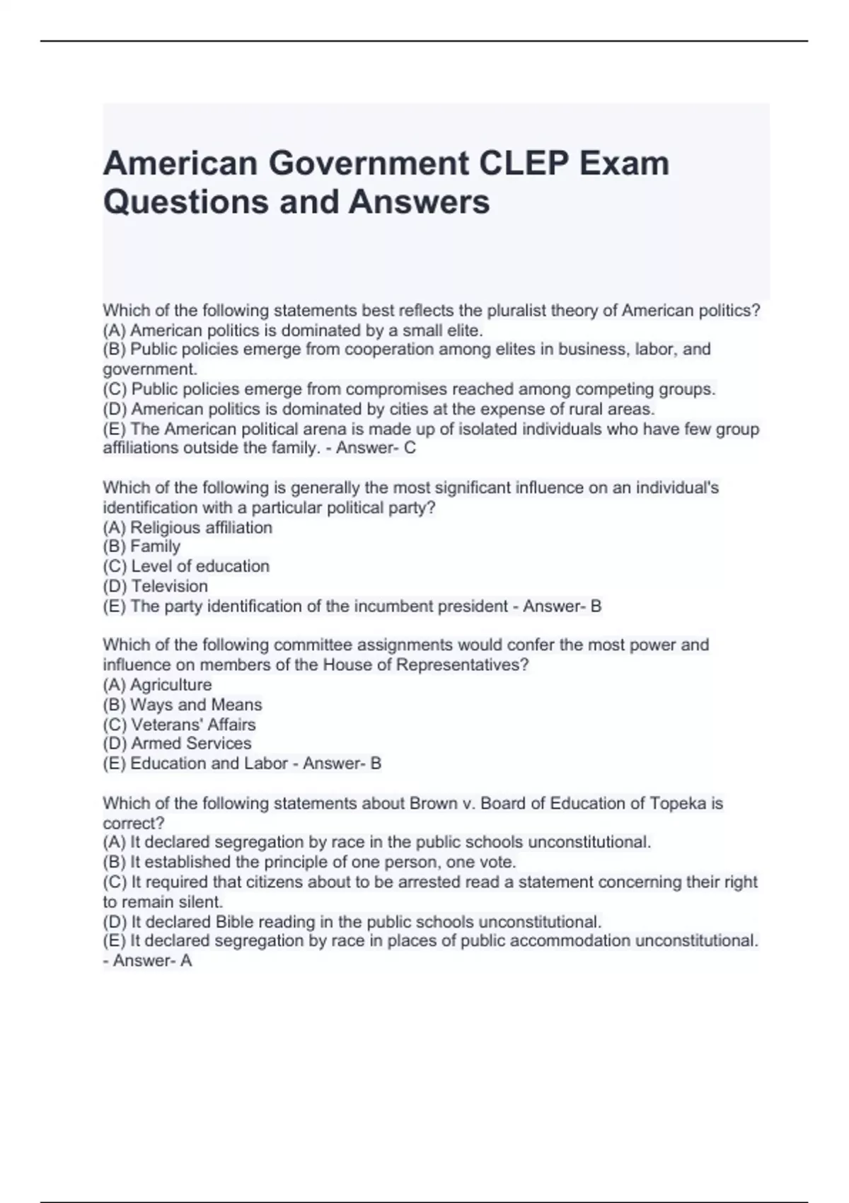 American Government CLEP Exam Questions and Answers