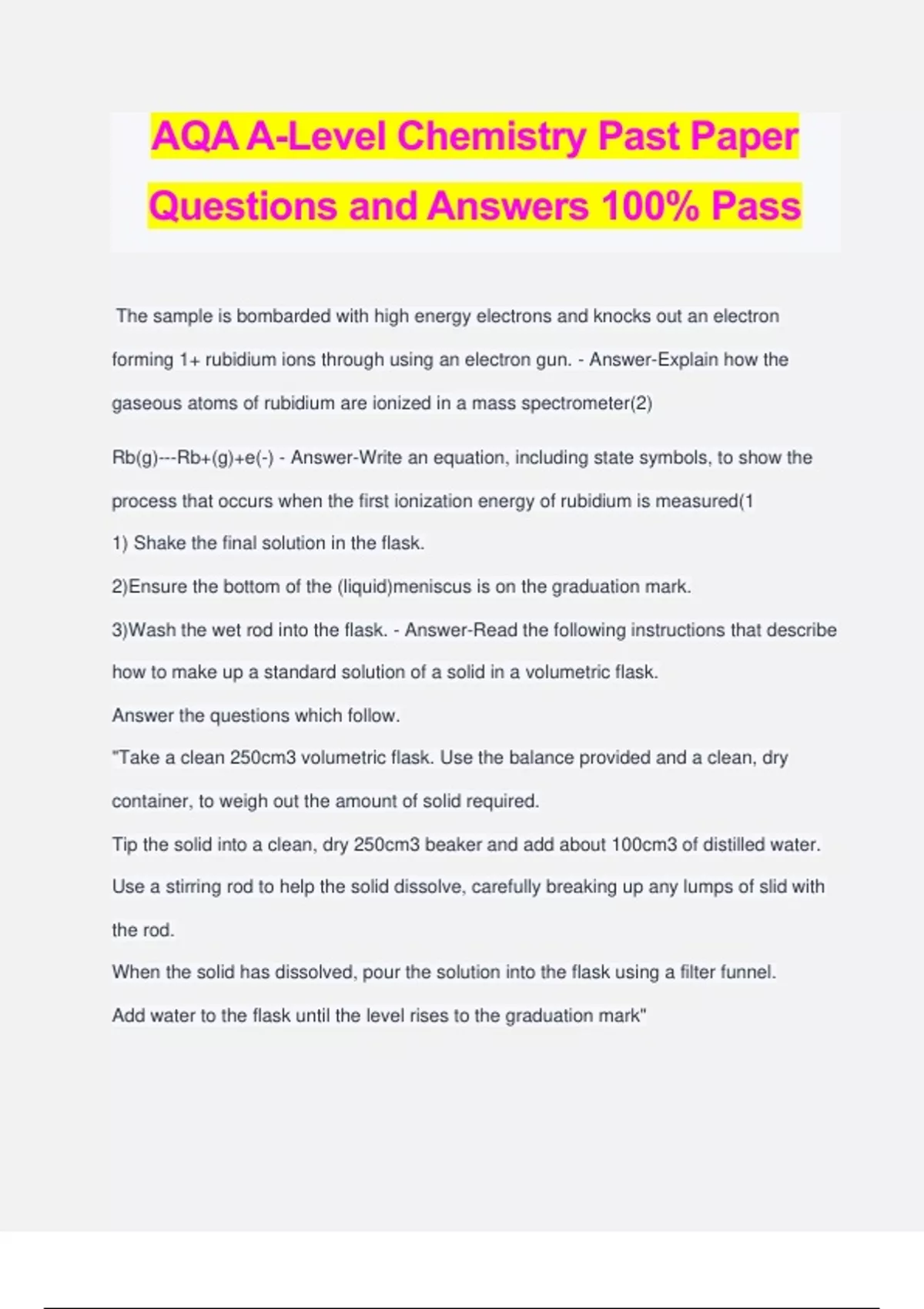 AQA A-Level Chemistry Past Paper Questions and Answers 100% Pass The sample is bombarded with high energy electrons and knocks out an electron forming 1+ rubidium ions through using an electron gun. - Answer-Explain how the gaseous atoms of rubidium are ionized in a mass spectrometer(2) Rb(g)---Rb+(g)+e(-) - Answer-Write an equation, including state symbols, to show the process that occurs when the first ionization energy of rubidium is measured(1 1) Shake the final solution in the flask. 2)Ensure the bottom of the (liquid)meniscus is on the graduation mark. 3)Wash the wet rod into the flask. - Answer-Read the following instructions that describe how to make up a standard solution of a solid in a volumetric flask. Answer the questions which follow. "Take a clean 250cm3 volumetric flask. Use the balance provided and a clean, dry container, to weigh out the amount of solid required. Tip the solid into a clean, dry 250cm3 beaker and add about 100cm3 of distilled water. Use a stirring rod to help the solid dissolve, carefully breaking up any lumps of slid with the rod. When the solid has dissolved, pour the solution into the flask using a filter funnel. Add water to the flask until the level rises to the graduation mark" SUGGEST THREE FURTHER INSTRUCTIONS WHICH WOULD IMPROVE THE OVERALL TECHNIQUE IN THIS ACCOUNT.(3)