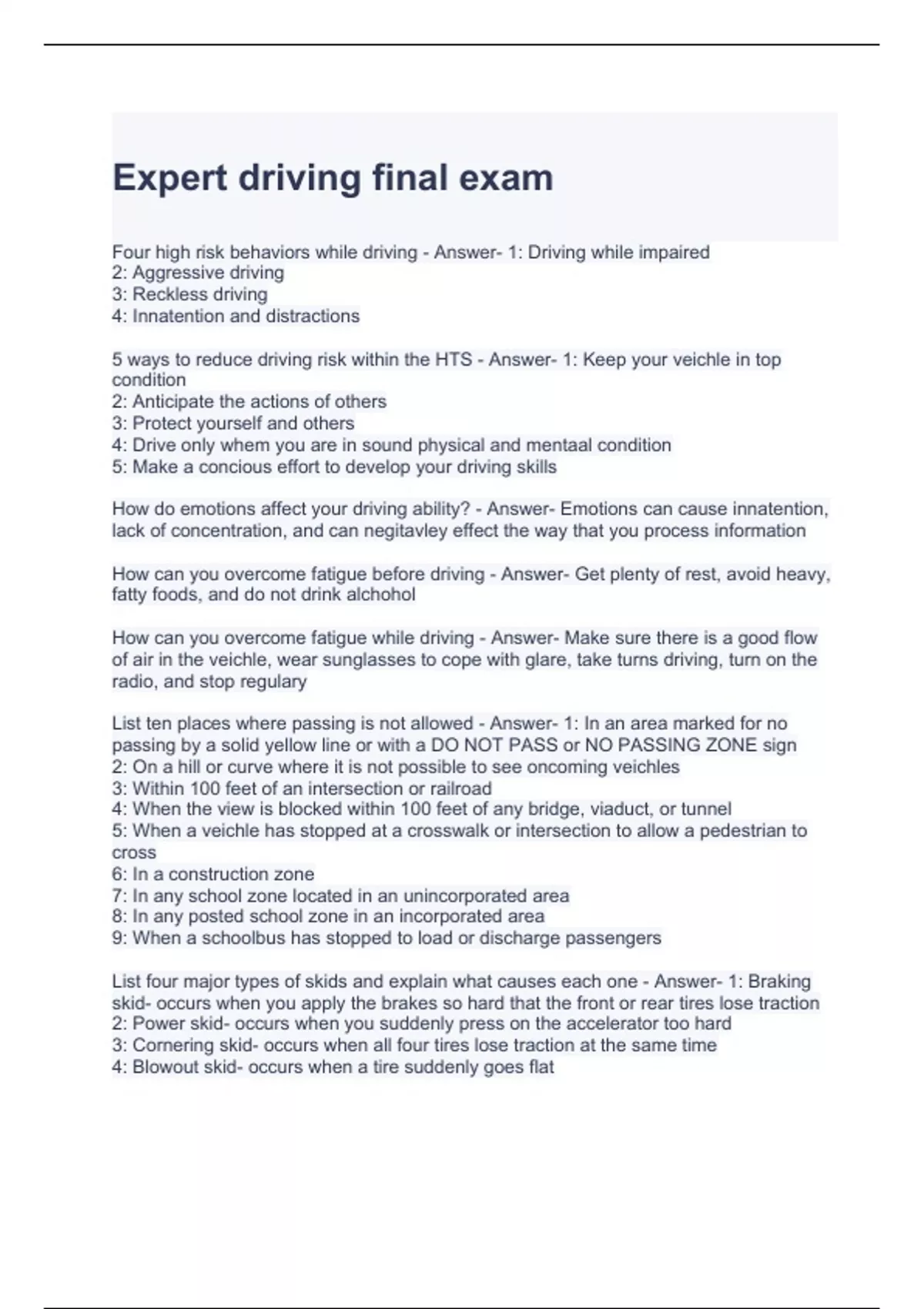 Expert driving final exam with correct answers