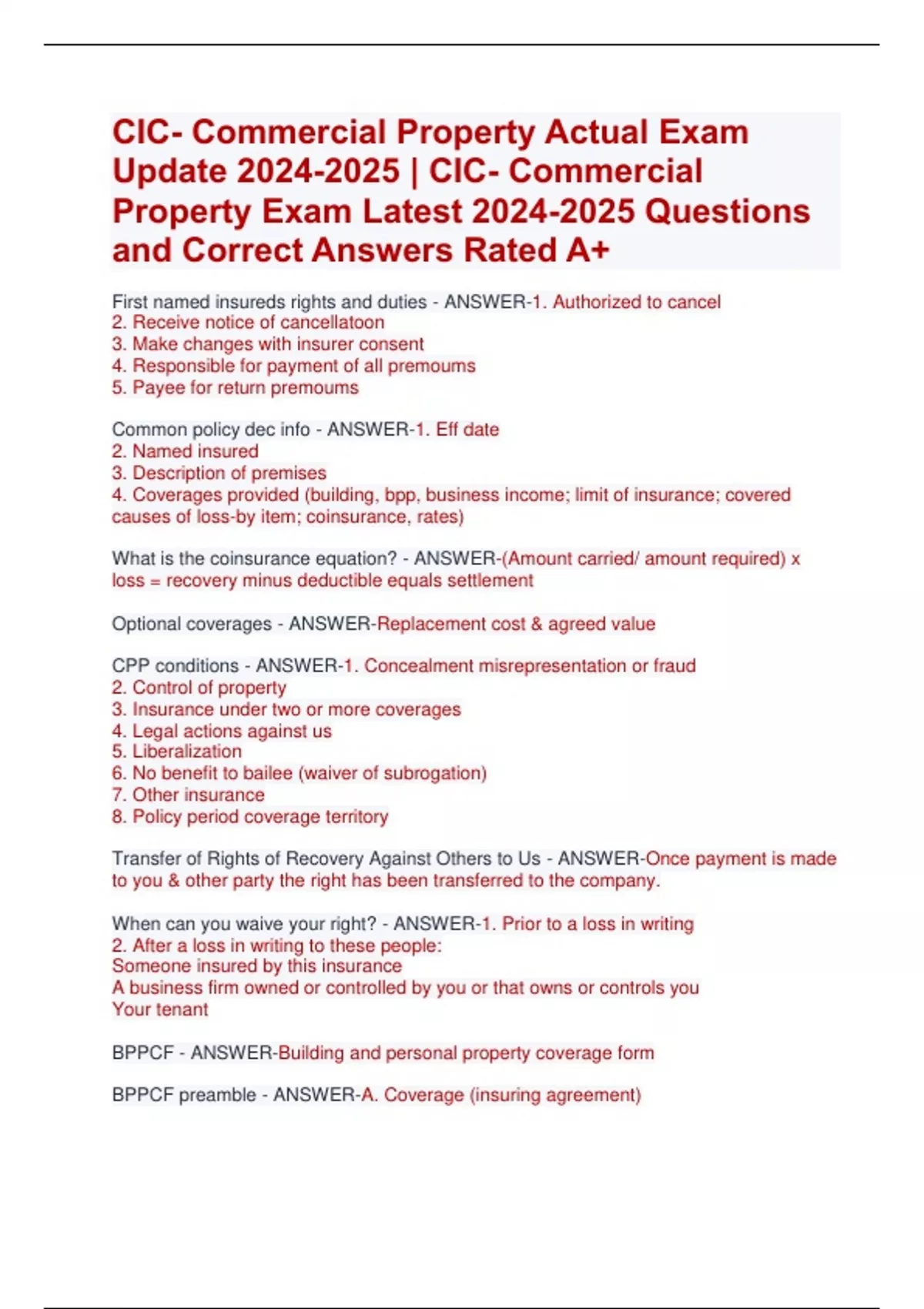 CIC- Commercial Property Actual Exam Update | CIC- Commercial Property Exam Latest Questions and Correct Answers Rated A+