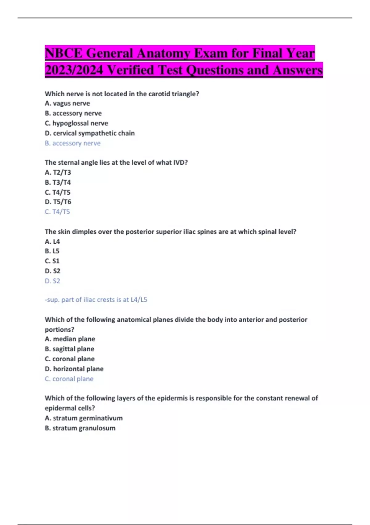 NBCE General Anatomy Exam Final Year 2023 Questions and Answers