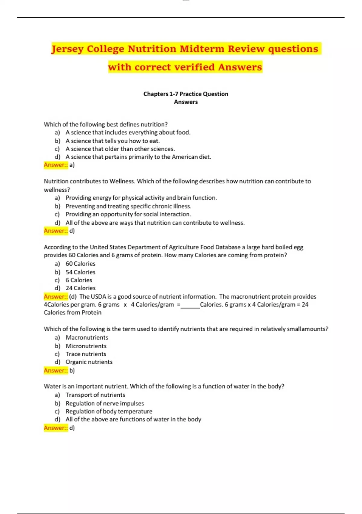 Jersey College Nutrition Midterm Review questions with correct verified Answers Which of the following best defines nutrition? a)A science that includes everything about food. b)A science that tells you how to eat. c)A science that older than other sciences. d)A science that pertains primarily to the American diet. Answer:: a) Nutrition contributes to Wellness. Which of the following describes how nutrition can contribute to wellness? a)Providing energy for physical activity and brain function. b)Preventing and treating specific chronic illness. c)Providing an opportunity for social interaction. d)All of the above are ways that nutrition can contribute to wellness. Answer:: d) According to the United States Department of Agriculture Food Database a large hard boiled egg provides 60 Calories and 6 grams of protein. How many Calories are coming from protein? a)60 Calories b)54 Calories c)6 Calories d)24 Calories Answer:: (d) The USDA is a good source of nutrient information. The macronutrient protein provides 4 Calories per gram. 6 grams x 4 Calories/gram = Calories. 6 grams x 4 Calories/gram = 24 Calories from Protein