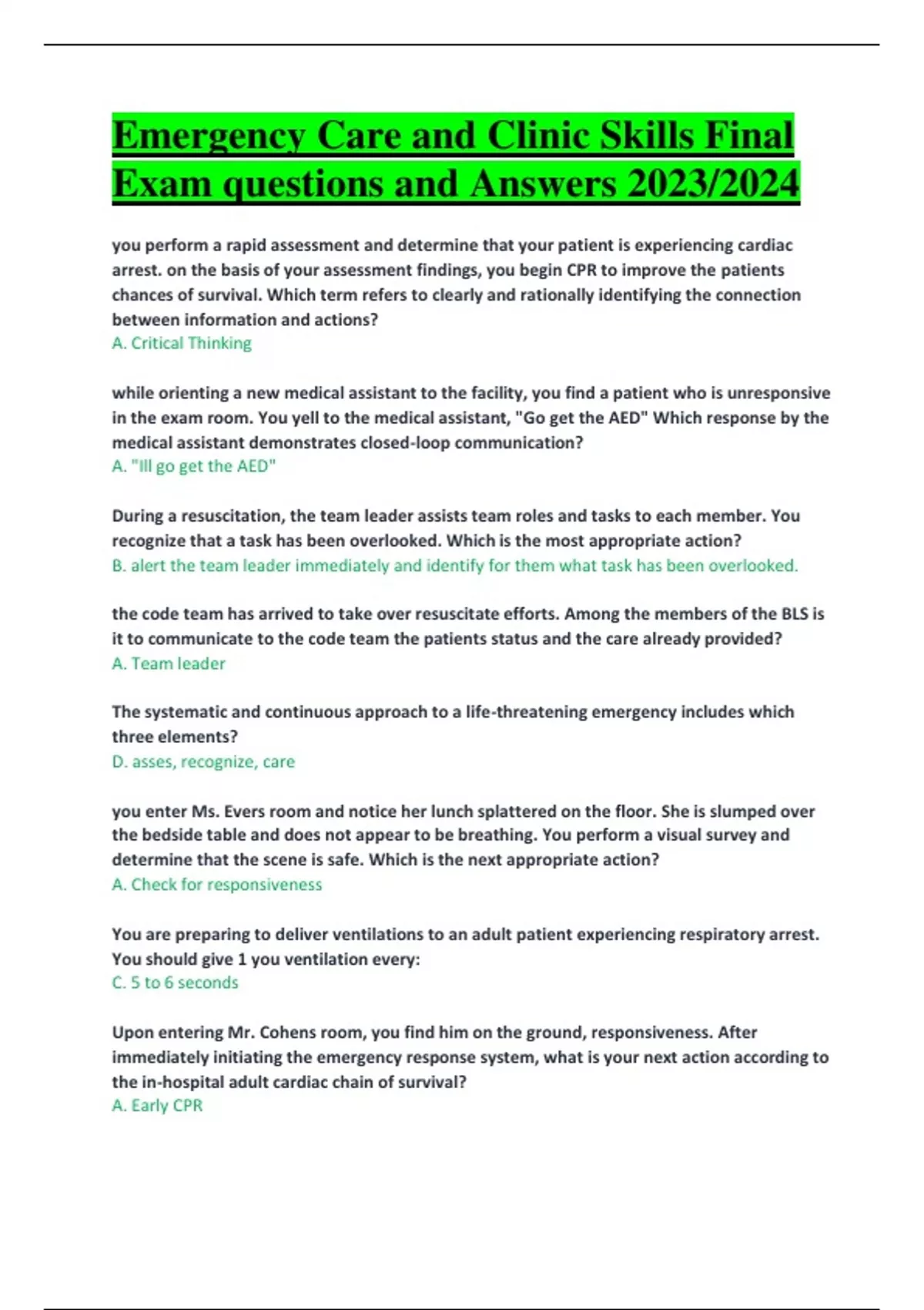 2023/2024 Emergency Care and Clinic Skills Final Exam questions and Answers