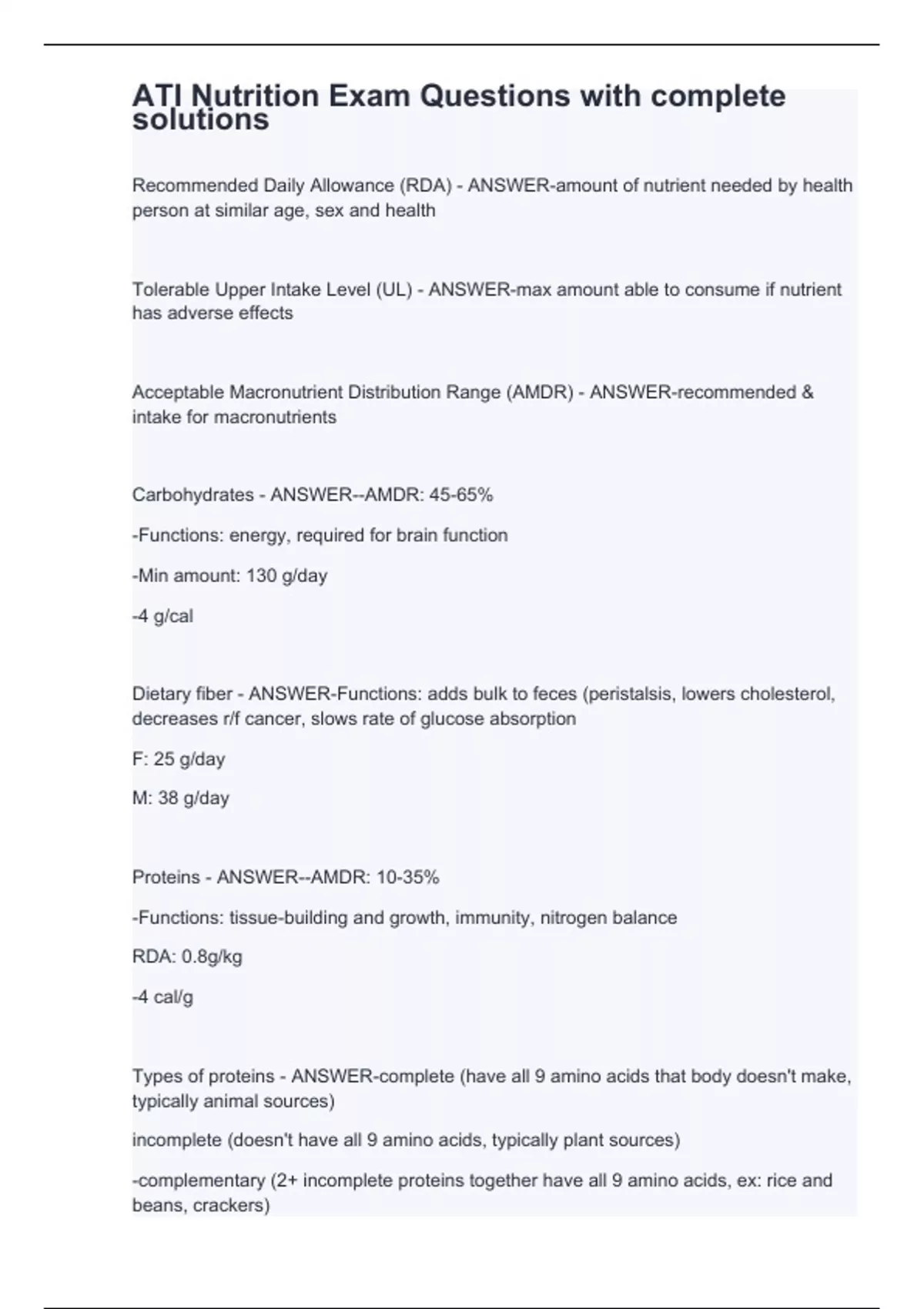 Recommended Daily Allowance (RDA) - ANSWER-amount of nutrient needed by health person at similar age, sex and health Tolerable Upper Intake Level (UL) - ANSWER-max amount able to consume if nutrient has adverse effects Acceptable Macronutrient Distribution Range (AMDR) - ANSWER-recommended & intake for macronutrients Carbohydrates - ANSWER--AMDR: 45-65% -Functions: energy, required for brain function -Min amount: 130 g/day -4 g/cal Dietary fiber - ANSWER-Functions: adds bulk to feces (peristalsis, lowers cholesterol, decreases r/f cancer, slows rate of glucose absorption F: 25 g/day M: 38 g/day Proteins - ANSWER--AMDR: 10-35% -Functions: tissue-building and growth, immunity, nitrogen balance RDA: 0.8g/kg -4 cal/g Types of proteins - ANSWER-complete (have all 9 amino acids that body doesn't make, typically animal sources) incomplete (doesn't have all 9 amino acids, typically plant sources) -complementary (2+ incomplete proteins together have all 9 amino acids, ex: rice and beans, crackers) too little: protein-energy malnutrition (edema, ascites)