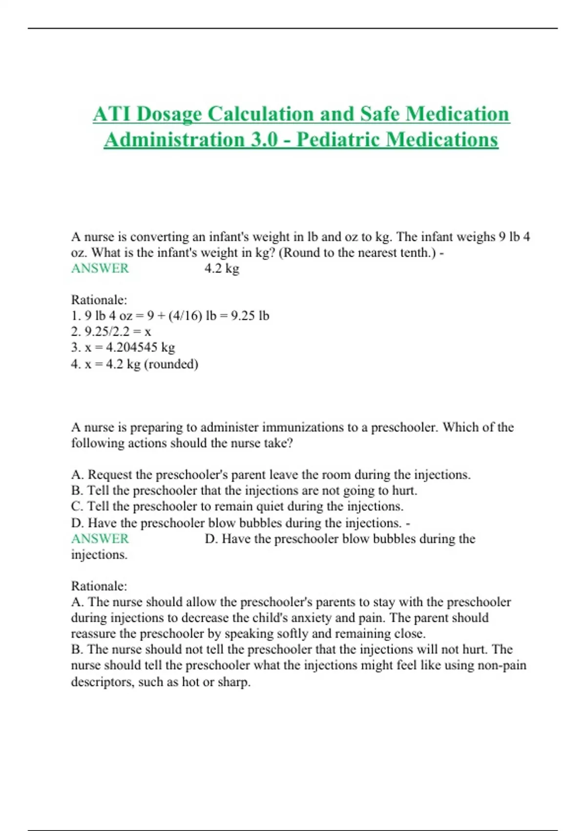 ATI Dosage Calculation and Safe Medication Administration 3.0 - Pediatric Medications A nurse is converting an infant's weight in lb and oz to kg. The infant weighs 9 lb 4 oz. What is the infant's weight in kg? (Round to the nearest tenth.) - ANSWER 4.2 kg Rationale: 1. 9 lb 4 oz = 9 + (4/16) lb = 9.25 lb 2. 9.25/2.2 = x 3. x = 4.204545 kg 4. x = 4.2 kg (rounded) A nurse is preparing to administer immunizations to a preschooler. Which of the following actions should the nurse take? A. Request the preschooler's parent leave the room during the injections. B. Tell the preschooler that the injections are not going to hurt. C. Tell the preschooler to remain quiet during the injections. D. Have the preschooler blow bubbles during the injections. - ANSWER D. Have the preschooler blow bubbles during the injections. Rationale: A. The nurse should allow the preschooler's parents to stay with the preschooler during injections to decrease the child's anxiety and pain. The parent should reassure the preschooler by speaking softly and remaining close. B. The nurse should not tell the preschooler that the injections will not hurt. The nurse should tell the preschooler what the injections might feel like using non-pain descriptors, such as hot or sharp. C. The nurse should encourage the preschooler to verbalize pain during the injections. The nurse should tell the child to concentrate on yelling at a volume that corresponds with the level of pain they are feeling. D. The nurse should use distraction as a nonpharmacological pain management technique for a preschooler. The nurse should have the preschooler blow bubbles during the injections.