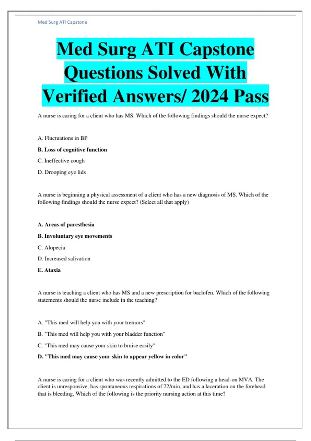 Med Surg ATI Capstone Questions Solved With Verified Answers/ 2024 Pass A nurse is caring for a client who has MS. Which of the following findings should the nurse expect? A. Fluctuations in BP B. Loss of cognitive function C. Ineffective cough D. Drooping eye lids A nurse is beginning a physical assessment of a client who has a new diagnosis of MS. Which of the following findings should the nurse expect? (Select all that apply) A. Areas of paresthesia B. Involuntary eye movements C. Alopecia D. Increased salivation E. Ataxia A nurse is teaching a client who has MS and a new prescription for baclofen. Which of the following statements should the nurse include in the teaching? A. "This med will help you with your tremors" B. "This med will help you with your bladder function" C. "This med may cause your skin to bruise easily" D. "This med may cause your skin to appear yellow in color"