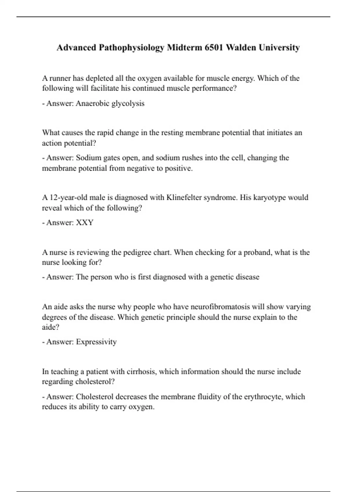 A runner has depleted all the oxygen available for muscle energy. Which of the following will facilitate his continued muscle performance? - Answer: Anaerobic glycolysis What causes the rapid change in the resting membrane potential that initiates an action potential? - Answer: Sodium gates open, and sodium rushes into the cell, changing the membrane potential from negative to positive. A 12-year-old male is diagnosed with Klinefelter syndrome. His karyotype would reveal which of the following? - Answer: XXY A nurse is reviewing the pedigree chart. When checking for a proband, what is the nurse looking for? - Answer: The person who is first diagnosed with a genetic disease An aide asks the nurse why people who have neurofibromatosis will show varying degrees of the disease. Which genetic principle should the nurse explain to the aide? - Answer: Expressivity In teaching a patient with cirrhosis, which information should the nurse include regarding cholesterol? - Answer: Cholesterol decreases the membrane fluidity of the erythrocyte, which reduces its ability to carry oxygen.When a patient asks what causes cystic fibrosis, how should the nurse respond? Cystic fibrosis is caused by an _____ gene - Answer: Autosomal recessive How are potassium and sodium transported across plasma membranes? - Answer: By adenosine triphosphate enzyme (ATPase) The nurse would be correct in identifying the predominant extracellular cation as: - Answer: Sodium The early dilation (swelling) of the cell's endoplasmic reticulum results in: - Answer: Reduced protein synthesis What principle should the nurse remember when trying to distinguish aging from diseases? - Answer: It is difficult to tell the difference because both processes are believed to result from cell injury. What is the diagnosis of a 13-year-old female who has a karyotype that reveals an absent homologous X chromosome with only a single X chromosome present? Her features include a short stature, widely spaced nipples, reduced carrying angle at the elbow, and sparse body hair. - Answer: Turner syndrome
