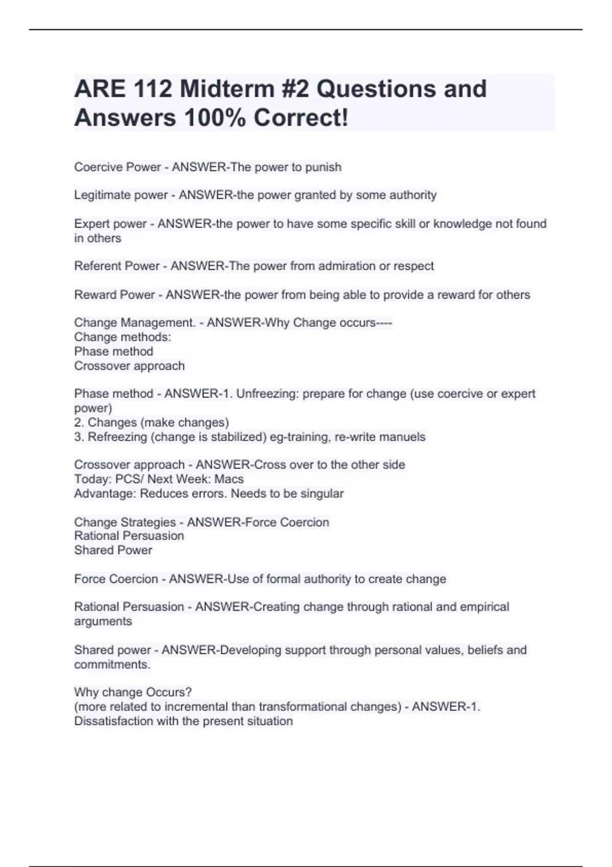 Coercive Power - ANSWER-The power to punish Legitimate power - ANSWER-the power granted by some authority Expert power - ANSWER-the power to have some specific skill or knowledge not found in others Referent Power - ANSWER-The power from admiration or respect Reward Power - ANSWER-the power from being able to provide a reward for others Change Management. - ANSWER-Why Change occurs---- Change methods: Phase method Crossover approach Phase method - ANSWER-1. Unfreezing: prepare for change (use coercive or expert power) 2. Changes (make changes) 3. Refreezing (change is stabilized) eg-training, re-write manuels Crossover approach - ANSWER-Cross over to the other side Today: PCS/ Next Week: Macs Advantage: Reduces errors. Needs to be singular Change Strategies - ANSWER-Force Coercion Rational Persuasion Shared Power Force Coercion - ANSWER-Use of formal authority to create change Rational Persuasion - ANSWER-Creating change through rational and empirical arguments Shared power - ANSWER-Developing support through personal values, beliefs and commitments. Why change Occurs? (more related to incremental than transformational changes) - ANSWER-1. Dissatisfaction with the present situation 2. External pressures 3. Momentum toward change Threats to the Change Process - ANSWER-1. Degree of change 2. Time frame 3. Impact of culture 4. Loss