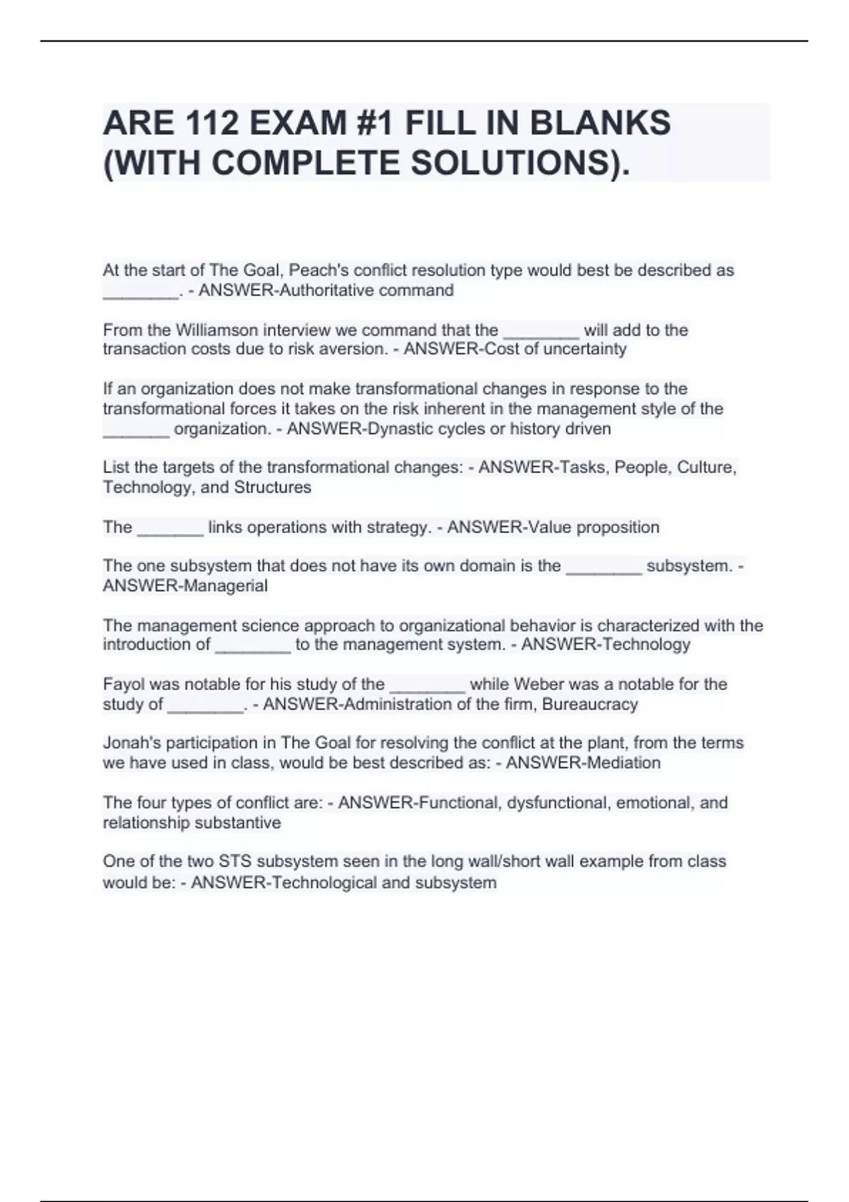 At the start of The Goal, Peach's conflict resolution type would best be described as ________. - ANSWER-Authoritative command From the Williamson interview we command that the ________ will add to the transaction costs due to risk aversion. - ANSWER-Cost of uncertainty If an organization does not make transformational changes in response to the transformational forces it takes on the risk inherent in the management style of the _______ organization. - ANSWER-Dynastic cycles or history driven List the targets of the transformational changes: - ANSWER-Tasks, People, Culture, Technology, and Structures The _______ links operations with strategy. - ANSWER-Value proposition The one subsystem that does not have its own domain is the ________ subsystem. - ANSWER-Managerial The management science approach to organizational behavior is characterized with the introduction of ________ to the management system. - ANSWER-Technology Fayol was notable for his study of the ________ while Weber was a notable for the study of ________. - ANSWER-Administration of the firm, Bureaucracy Jonah's participation in The Goal for resolving the conflict at the plant, from the terms we have used in class, would be best described as: - ANSWER-Mediation The four types of conflict are: - ANSWER-Functional, dysfunctional, emotional, and relationship substantive