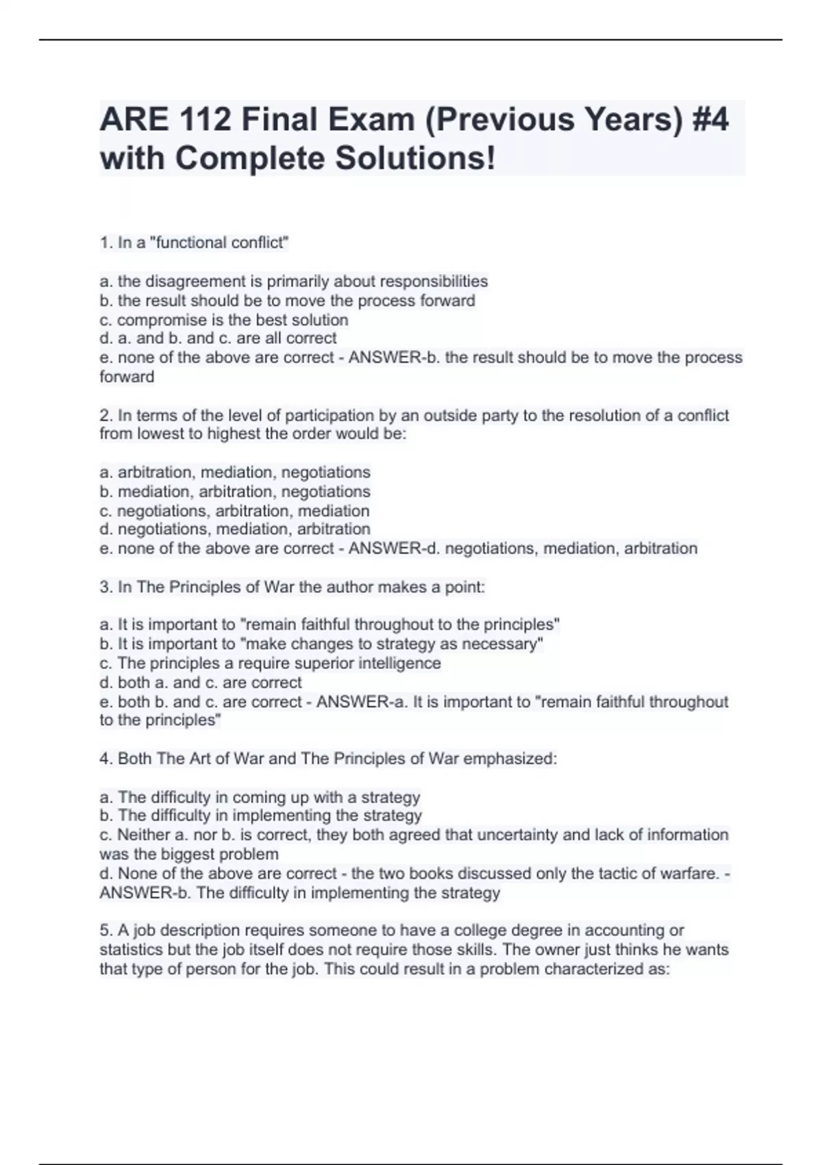 1. In a "functional conflict" a. the disagreement is primarily about responsibilities b. the result should be to move the process forward c. compromise is the best solution d. a. and b. and c. are all correct e. none of the above are correct - ANSWER-b. the result should be to move the process forward 2. In terms of the level of participation by an outside party to the resolution of a conflict from lowest to highest the order would be: a. arbitration, mediation, negotiations b. mediation, arbitration, negotiations c. negotiations, arbitration, mediation d. negotiations, mediation, arbitration e. none of the above are correct - ANSWER-d. negotiations, mediation, arbitration 3. In The Principles of War the author makes a point: a. It is important to "remain faithful throughout to the principles" b. It is important to "make changes to strategy as necessary" c. The principles a require superior intelligence d. both a. and c. are correct e. both b. and c. are correct - ANSWER-a. It is important to "remain faithful throughout to the principles" 4. Both The Art of War and The Principles of War emphasized: a. The difficulty in coming up with a strategy b. The difficulty in implementing the strategy c. Neither a. nor b. is correct, they both agreed that uncertainty and lack of information was the biggest problem d. None of the above are correct - the two books discussed only the tactic of warfare. - ANSWER-b. The difficulty in implementing the strategy 5. A job description requires someone to have a college degree in accounting or statistics but the job itself does not require those skills. The owner just thinks he wants that type of person for the job. This could result in a problem characterized as: a. exempt and nonexempt employees b. accommodation c. competing objectives d. disparate impact e. disparate treatment - ANSWER-d. disparate impact 6. The two sections we read from The Principles of War were about: a. training and managing b. ethics and punishment c. politics and diplomacy d. strategy and application of the strategies - ANSWER-d. strategy and application of the strategies 7. The concept of protected classes have to do with: a. abilities and equal access b. all persons of color c. U. S. citizens only d. both b. and c. e. a. and b. and c. are all correct - ANSWER-b. all persons of color 8. The McKinsey problem solving approach included: a. fact based. b. being flexible. c. open ended. d. both a. and b. are correct. e. a. and b. and c. are all correct - ANSWER-a. fact based. 9. In the HBR article "What Leaders Really Do" the author stated that leaders: a. plan b. organize c. struggle thru change. d. both a. and c.