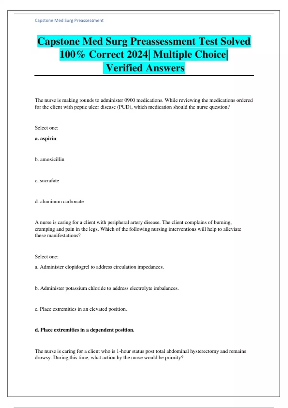 Capstone Med Surg Preassessment Test Solved 100% Correct 2024| Multiple Choice| Verified Answers,Capstone Med Surg Preassessment Test Solved 100% Correct 2024| Multiple Choice| Verified Answers
