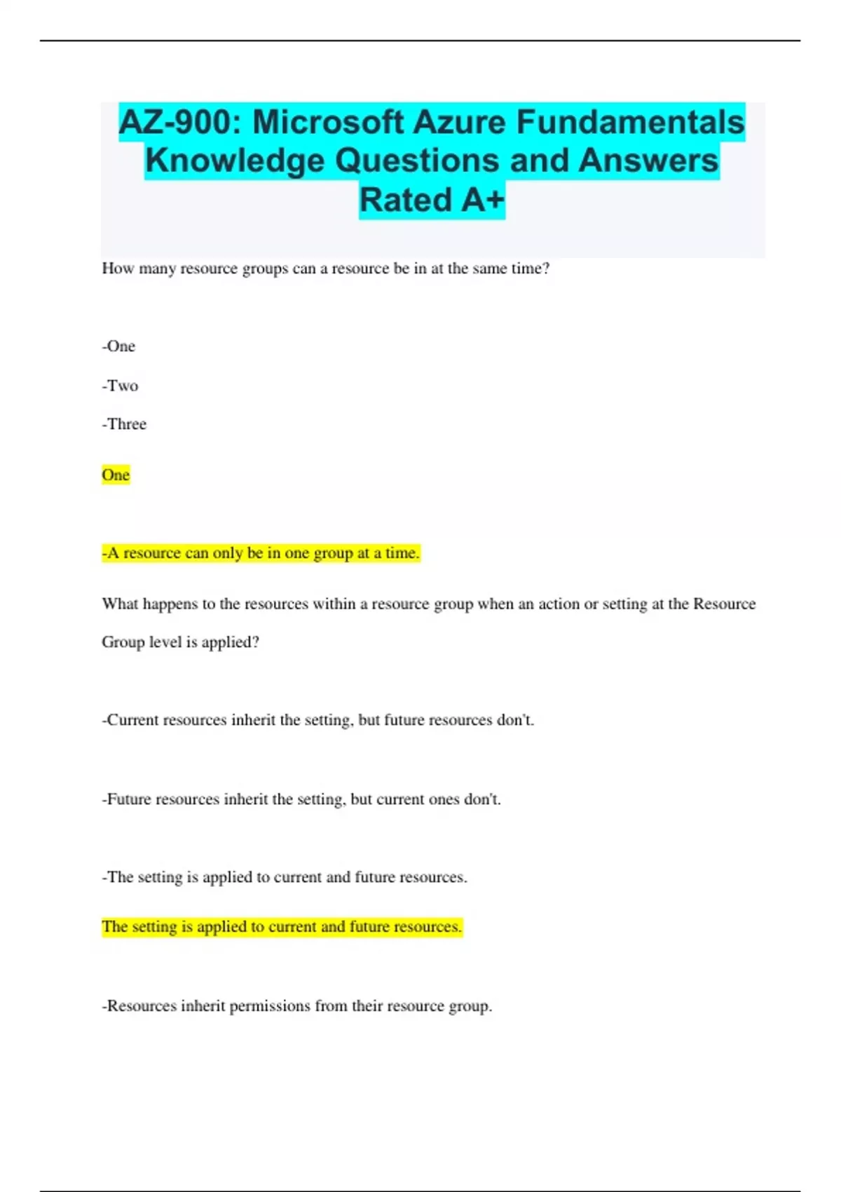 AZ-900: Microsoft Azure Fundamentals Knowledge Questions and Answers Rated A+ How many resource groups can a resource be in at the same time? -One -Two -Three One -A resource can only be in one group at a time. What happens to the resources within a resource group when an action or setting at the Resource Group level is applied? -Current resources inherit the setting, but future resources don't. -Future resources inherit the setting, but current ones don't. -The setting is applied to current and future resources. The setting is applied to current and future resources. -Resources inherit permissions from their resource group. What Azure feature replicates resources across regions that are at least 300 miles away from each other? -Region pairs -Availability Zones -Sovereign regions Region pairs -Most Azure regions are paired with another region within the same geography (such as US, Europe, or Asia) at least 300 miles away. Which Azure Virtual Machine feature staggers updates across VMs based on their update domain and fault domain? -Availability sets -Scale sets -Update sets Availability sets -Availability sets stagger VM updates based on their update and fault domains. Which Azure service allows users to use a cloud hosted version of Windows from any location and connect from most modern browsers? -Azure Virtual Desktop -Azure Virtual Machines -Azure Container Instances Azure Virtual Desktop -Azure Virtual Desktop provides access to a cloud-hosted version of Windows, and it works with most modern browsers. Which tool automatically keeps files between an on-premises Windows server and an Azure cloud environment updated? -Azure File Sync -Azure Storage Explorer -AzCopy Azure File Sync -Azure File Sync maintains a bidirectional synchronization of files between your on-premises and cloud Windows servers. Which storage redundancy option provides the highest degree of durability, with 16 nines of durability? -Locally redundant storage -Zone-redundant storage -Geo-zone-redundant-storage Geo-zone-redundant-storage -Geo-redundant storage (GRS) and geo-zone-redundant storage (GZRS) both provide 16 nines of durability. Which Azure Storage service supports big data analytics, as well as handling text and binary data types? -Azure Blobs -Azure Files -Azure Disks Azure Blobs -Azure Blobs is a massively scalable object store for text and binary data. Azure Blobs also includes support for big data analytics through Data Lake Storage Gen2. Which Azure Active Directory tool can vary the credentials needed to log in based on signals, such as where the user is located?